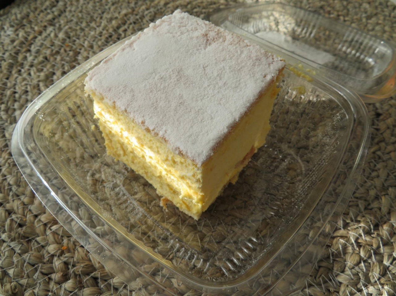 私たちはバゲット風パンを使ったサンドイッチ、ドイツの塩パン風のパンを使ったサンドイッチのほか、クレムピタ(パイ皮の間にたっぷりのクリームを挟んで立方体に切り分けたお菓子)を買ってみました。