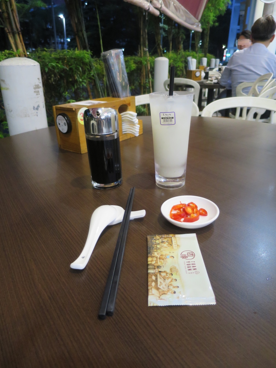 便利なロケーションとは言えないものの、人気店のようで、夕飯時に行ったら、冷房の効いた店内は満席。外のテーブル席に案内されました。