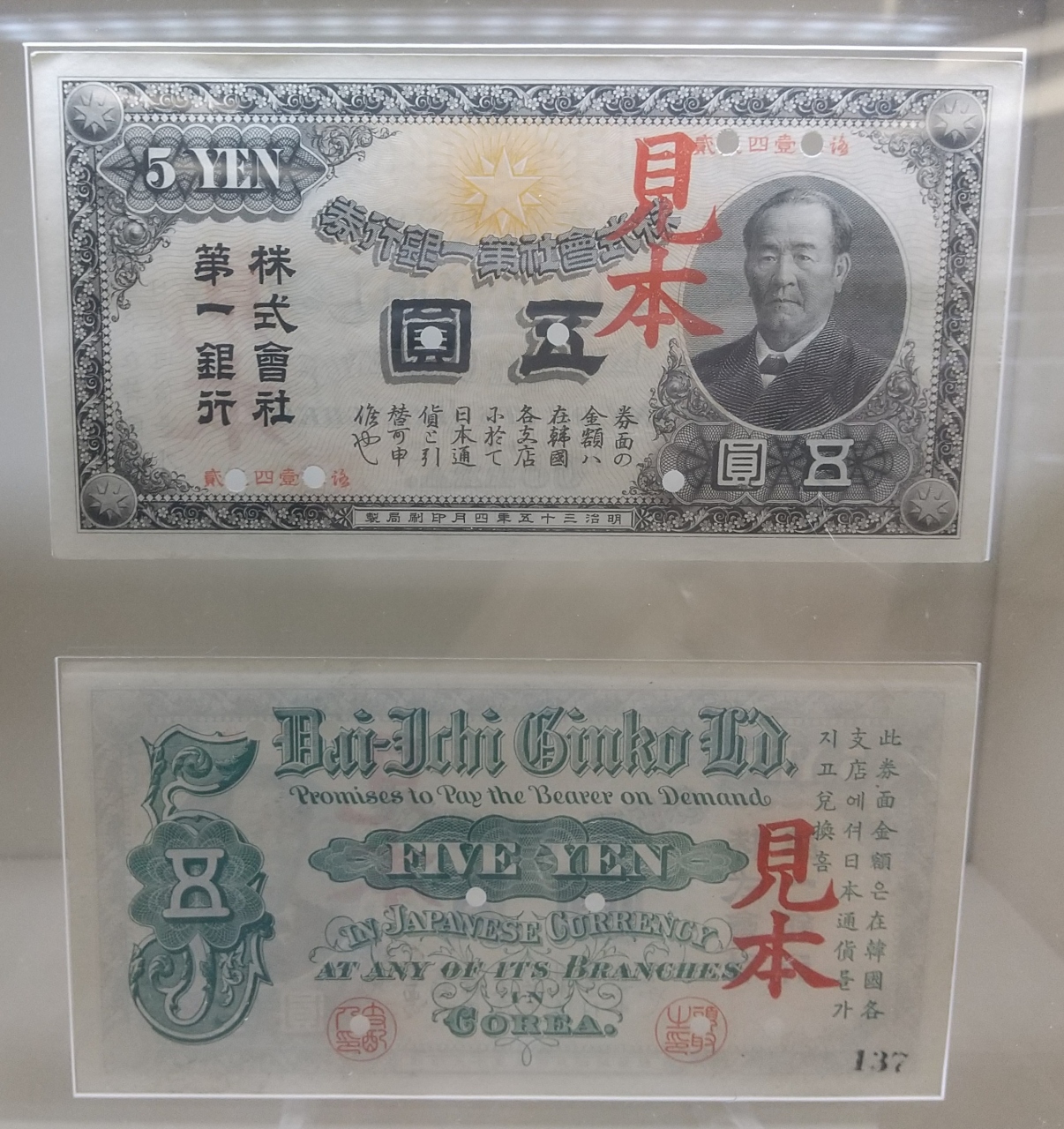 渋沢栄一さんの肖像が描かれた戦前のお札が展示されている