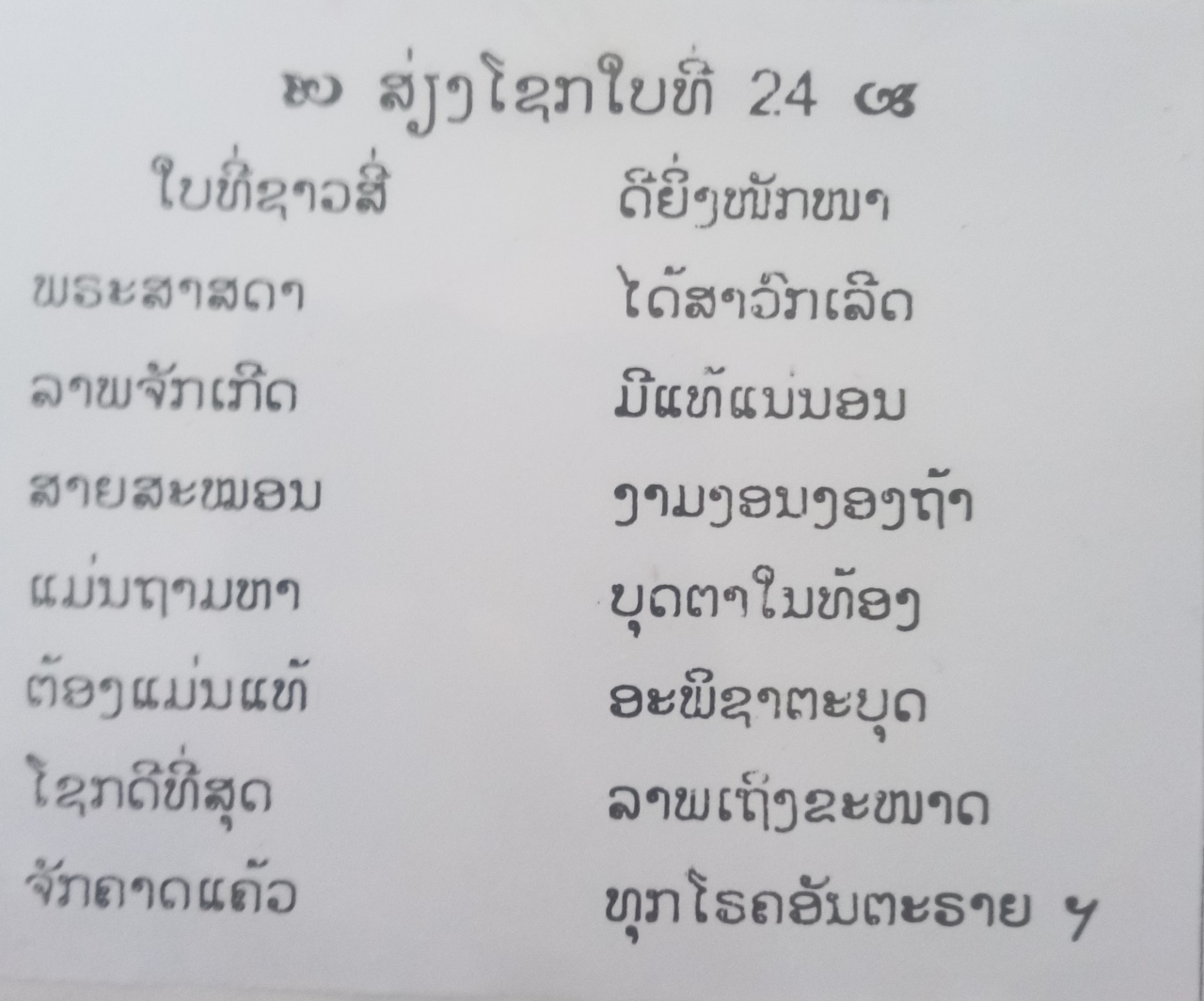 特筆することはおみくじがあることです。私もおみくじを引いてみました。そこには誰もいないので勝手に引いてきました。日本と同じで細い棒を引くと先に番号が書いてあって、その横に各々の番号のおみくじが置いてあります。すべてラオス語で書いてあるので何のことだかわかりません。でも今はGoogleレンズなどで翻訳できますのでなんとなくわかります。ラオスの寺院でおみくじを引いたのは初めての経験なので新鮮でした。