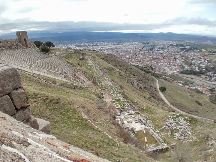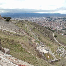「アクロポリス」に入り、まずは2世紀に建立された「トラヤヌス帝の神殿」を見ました。白い大理石が特徴で、一番見ごたえがありました。ベルガマの町や周囲の風景を一望することもできて景色も良かったです。トラヤヌス帝神殿の下にはアーチ構造の通路が付いていました。美しいアーチの連続が印象的でしたが、ペルガモンのアクロポリスは急峻な斜面に建設されたため、建築物の土台を補強するのに支柱のある回廊(ストア)が必要だったのだそうです。崖の斜面には約45度の傾斜をもち、世界でも最も急勾配だと言われる劇場もありました。1万人が収容できるこの劇場はとても見ごたえがありました。劇場の隣には「ディオニュソス神殿」がありました。古代ギリシャでは酒神ディオニュソスに捧げられた芝居がよく演じられたことから劇場の近くに建っているのだそうです。その後、羊皮紙ペルガモンが発明され20万冊の蔵書があったという図書館やペルガモン最古の神殿「アテネ神殿」のあったあたりを見学し、紀元前2世紀に戦勝を記念して作られたという「ゼウスの祭壇」を見て見学を終えました。