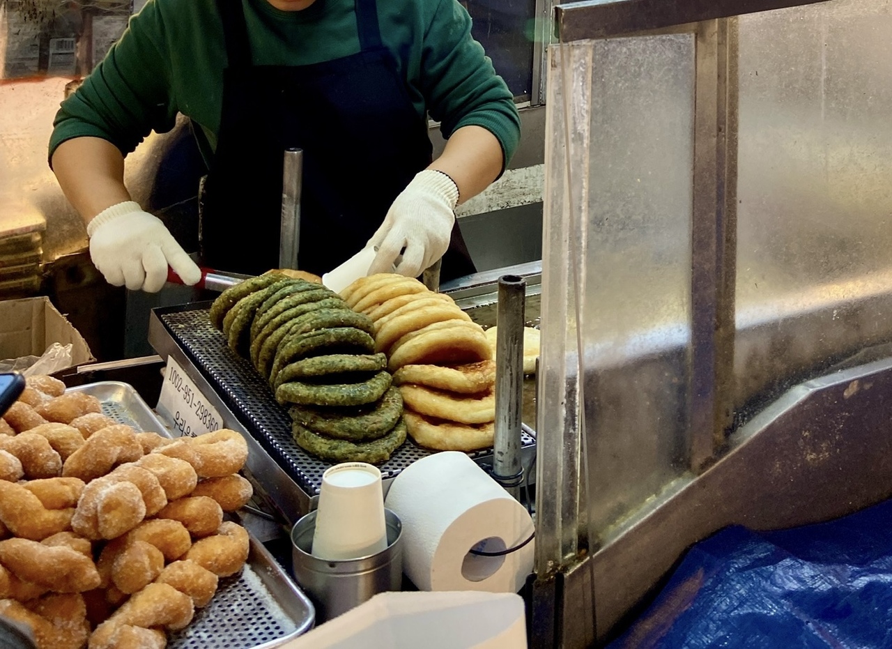 この市場来たら有名なドーナツ屋さんの近くのトーストをいただく。安くてとても美味しいです。今回はこの近くの屋台のよもぎホットックの評判を聞いて買いましたが、本当に美味しかった。よもぎのホットックの生地に蜂蜜入り。買って帰りたいぐらい感動しました。モニョキンパはテイクアウトして、ホテルでいただきましたがこれも間違いなくおすすめできます。
