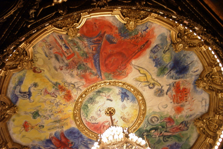 ゛オペラガルニエ゛はパリの中心の地下鉄のオペラ駅前に在ります。内外とも豪華な装飾の建物で屋根には金箔の一対の飾りが在りますし、館内の天井画はシャガールが描いた素晴らしい絵画です。今は新しいオペラ座は違うエリアに建てられましたが、こちらのオペラガルニエは交通が便利でパリに住む友人と待ち合わせします、