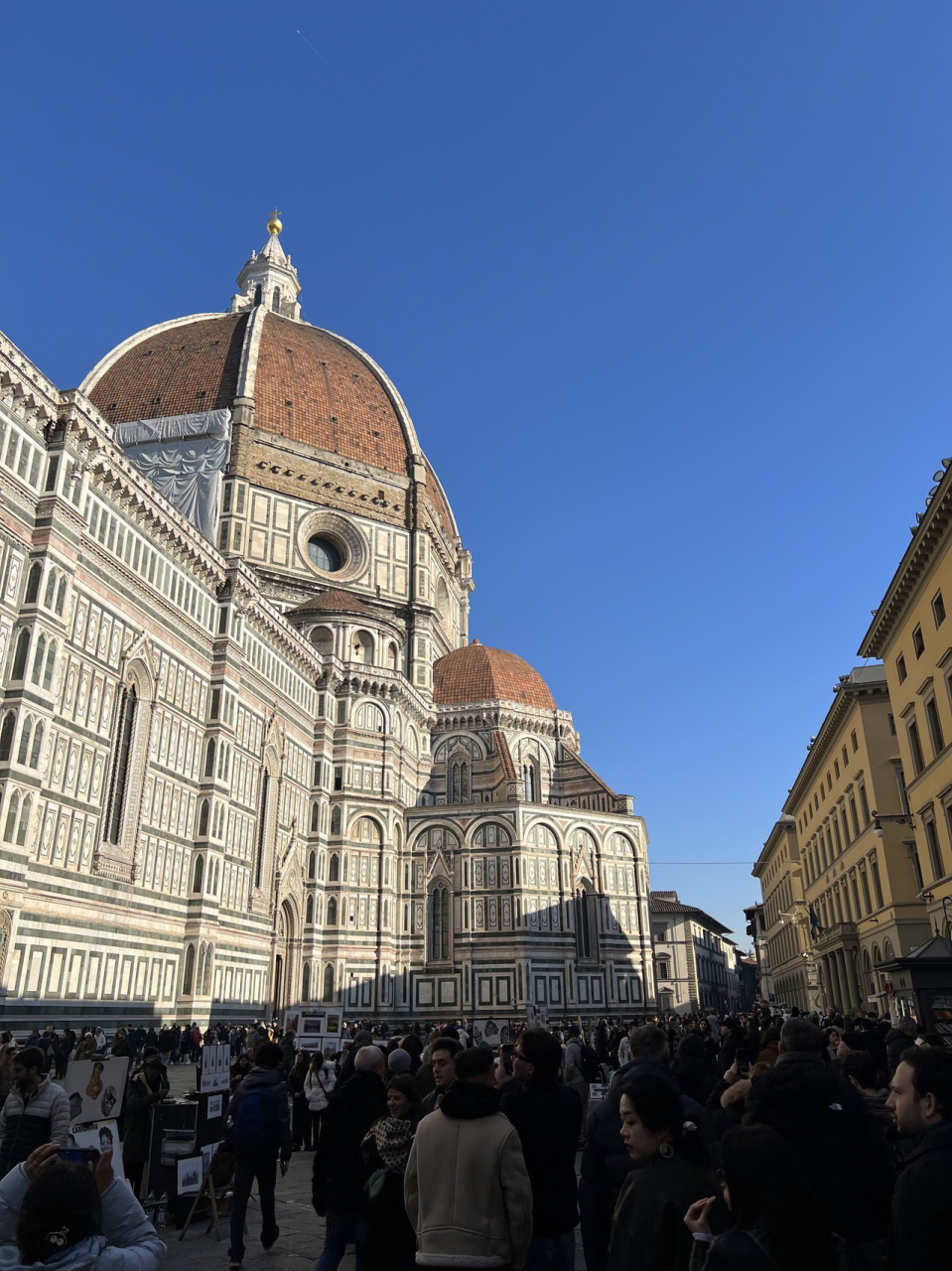 屋根の全体は、真下からは見えず、ウフィツィ美術館のテラスやミケランジェロ広場から見ることになりますが、真下からは、歴史的な赤い屋根と、鮮やかな聖堂部分の対比が面白いと感じました。