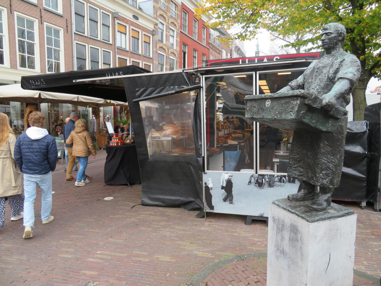 ライデン周辺に曜日と場所を替えて立つ市場の内、水・土曜日に市庁舎脇のニーウェ・レイン川沿いに並ぶのは食品主体の市場。