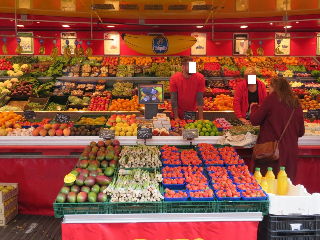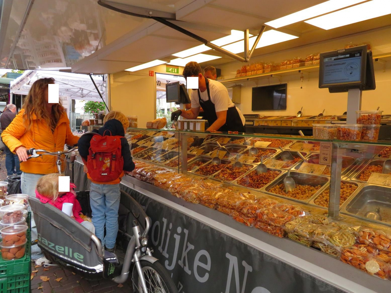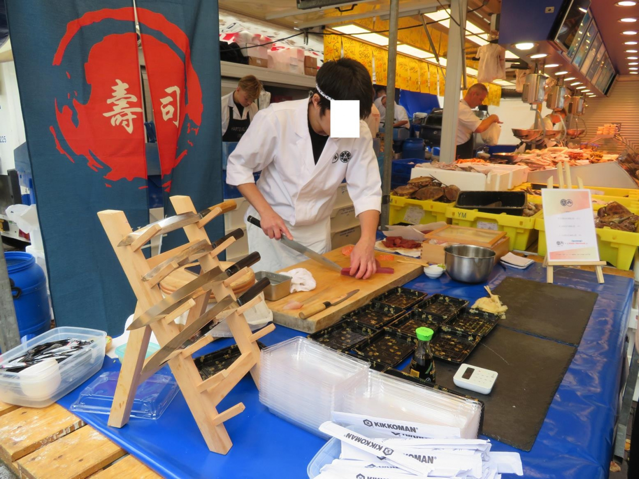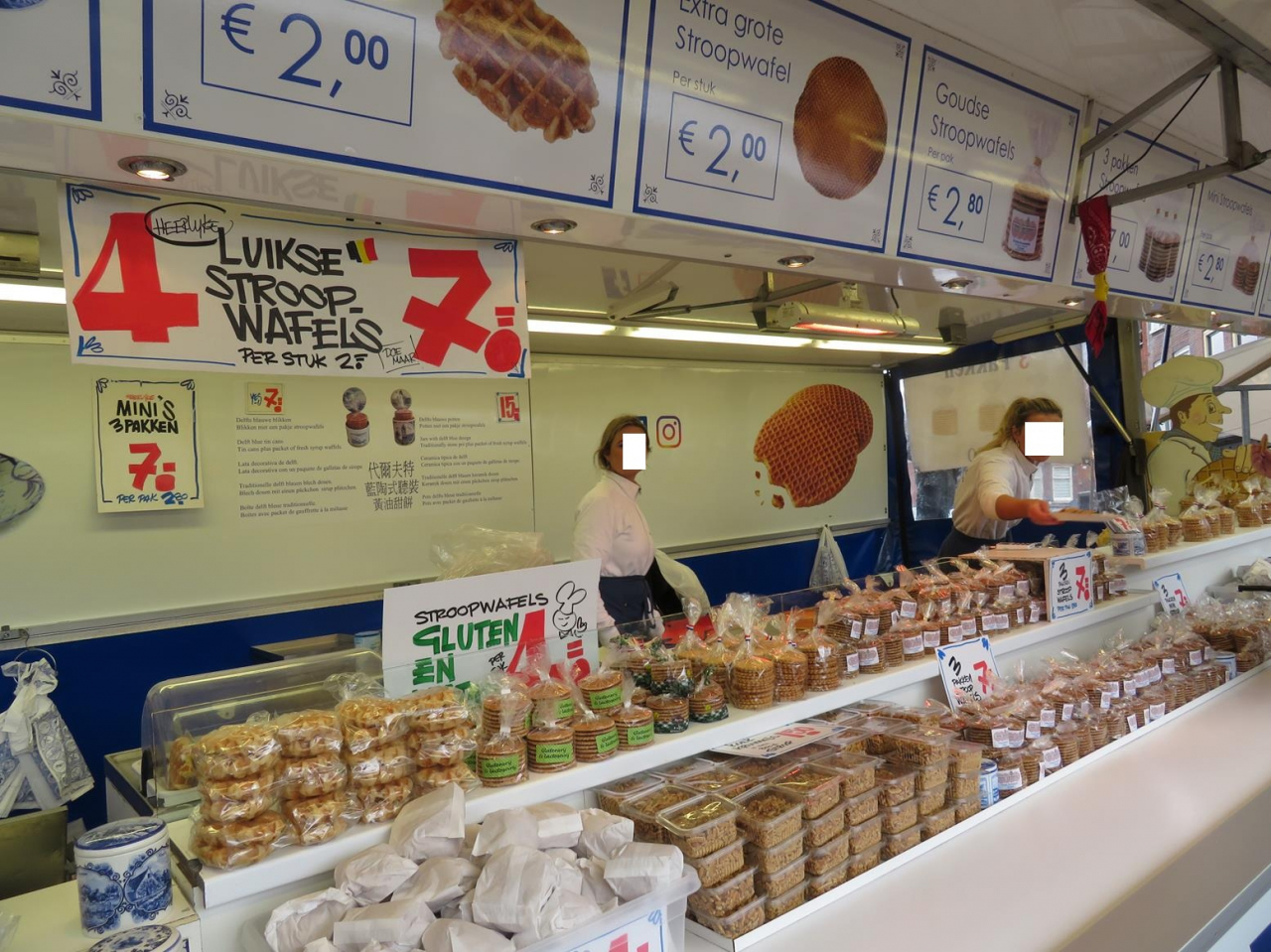 野菜や鮮魚、大きな塊のチーズなどの食材は旅行者には買いにくいですが、すでに焼き上げたワッフルなどのお菓子、その場で作ってくれるシーフードの揚げ物やサンドイッチがあったり、中にはお寿司やラーメン、カレーのお店もあり、食べ歩きが楽しい市場。