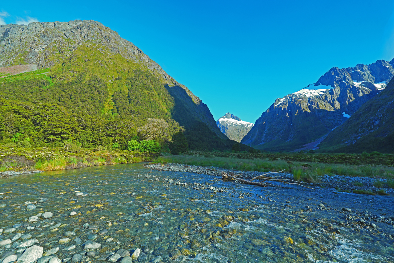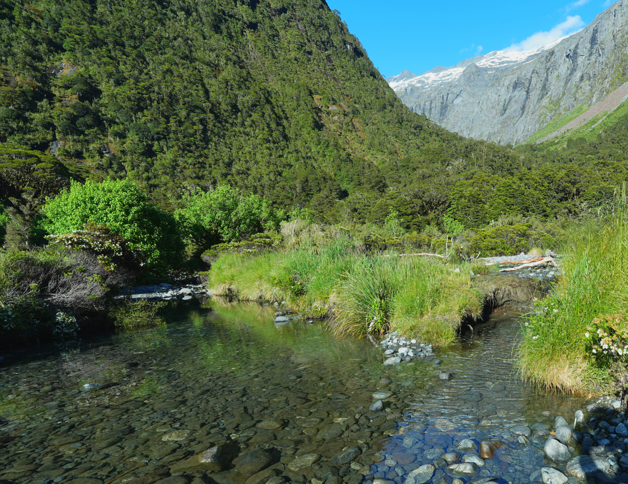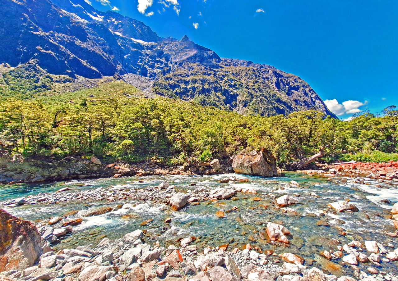テアナウ方面からミルフォードサウンドへの道中にあるクリーク(渓谷)です。車が停められる場所があり、クィーンズタウンなどから来たバスなどもここで途中休憩をとりながら観光をするようで、昼はにぎわっています。