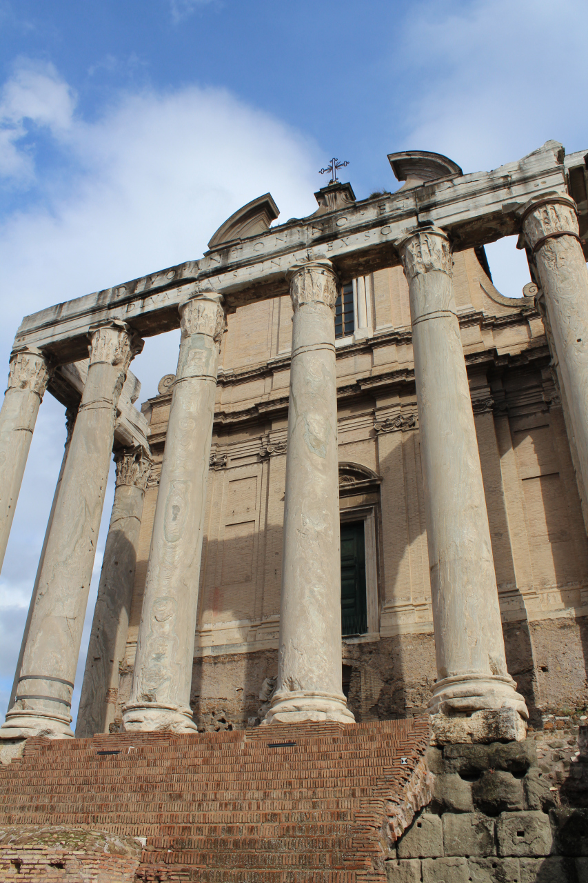アントニヌス・ピウスとファウスティナ神殿は、Via dei Fori Imperialiの入り口から入るとすぐ左にあります。