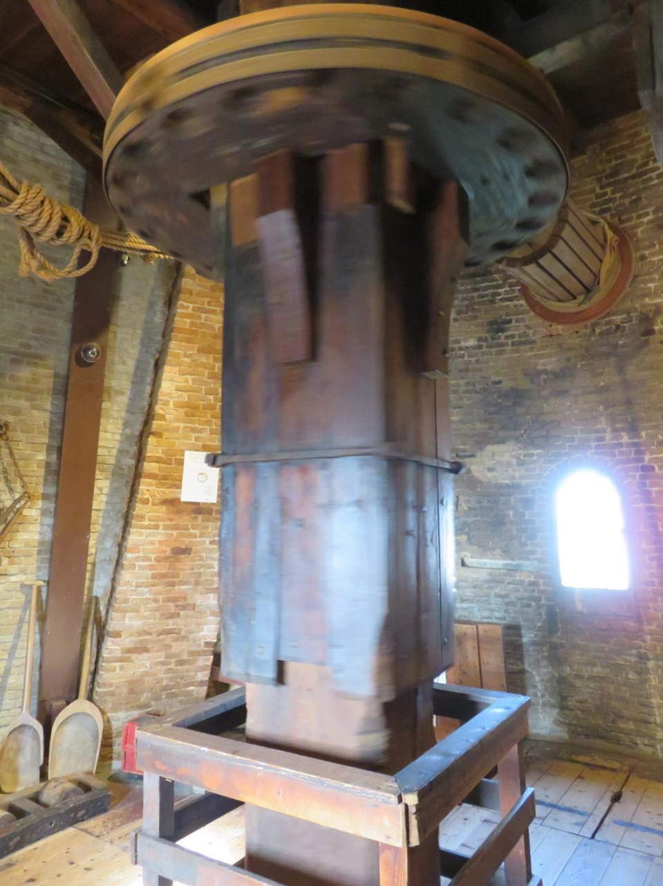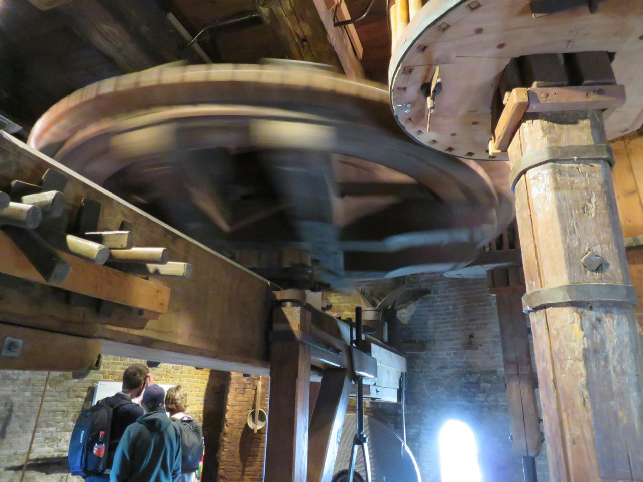 今は粉挽きなどには使われていない風車ですが、羽は回していて、風車を縦に貫く心棒や巨大な歯車が回っている様子も間近に見られるのがよし。