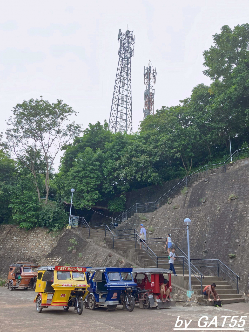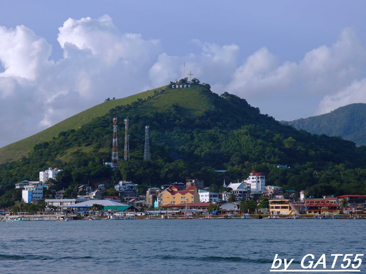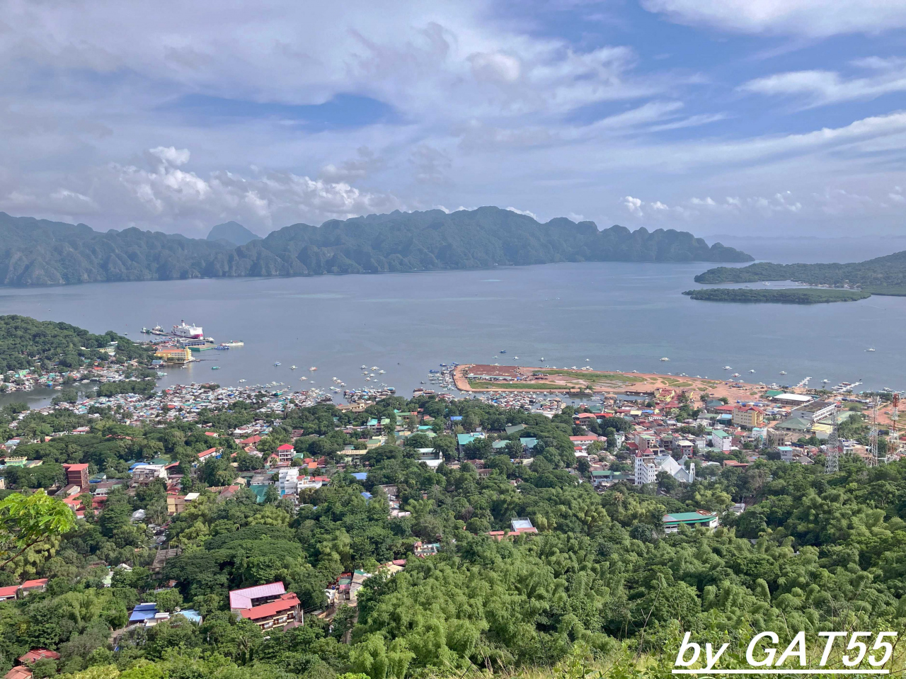 山頂からはコロンの町と対岸のコロン島のほか小さな島々が一望できますが、町の沖合で埋立て工事をしており、茶色の埋立て地が風景を台無しにしています。