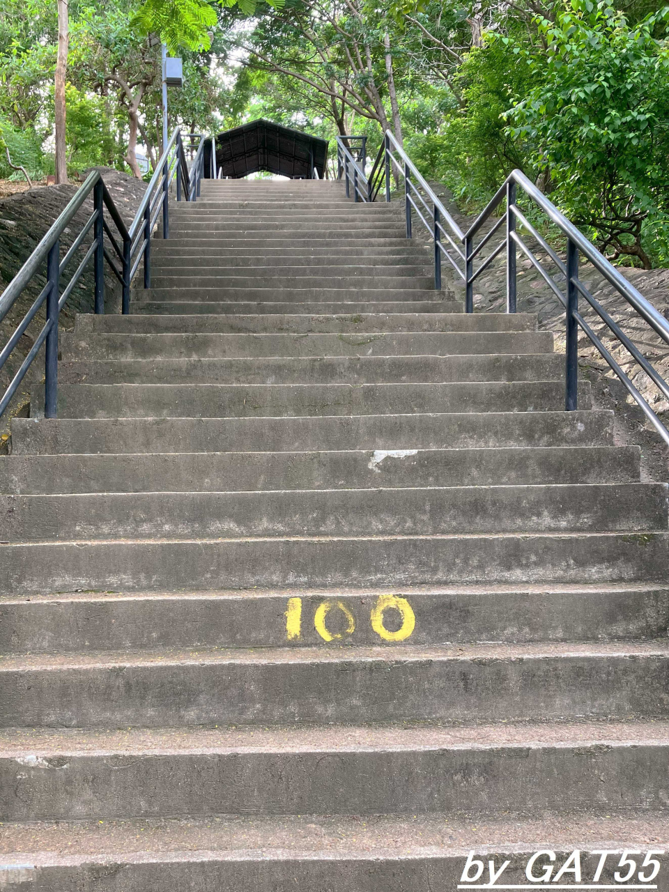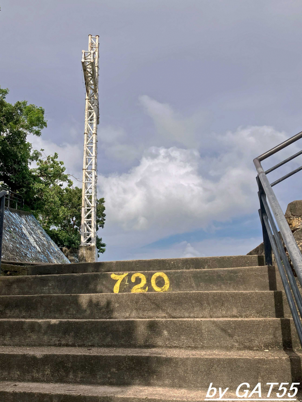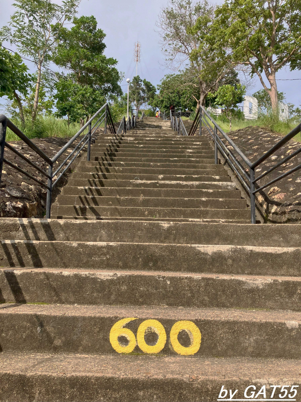 階段には100段おきにペンキで数字が書かれており721段の階段を登り続けると約20分で頂上に到着します。頂上には白亜の十字架がありますが近くで見るとトラス状の鉄製構造物でイマイチです。