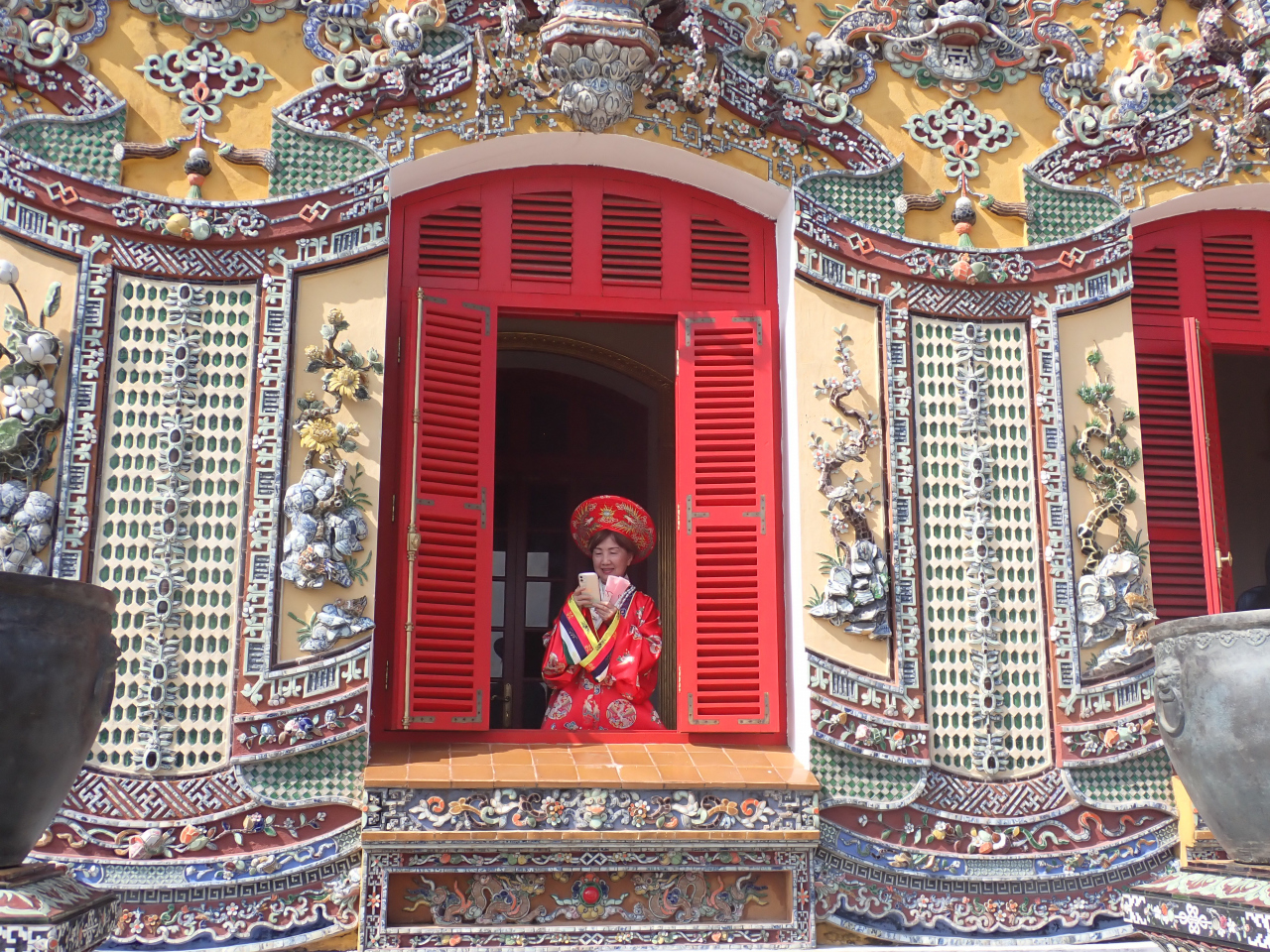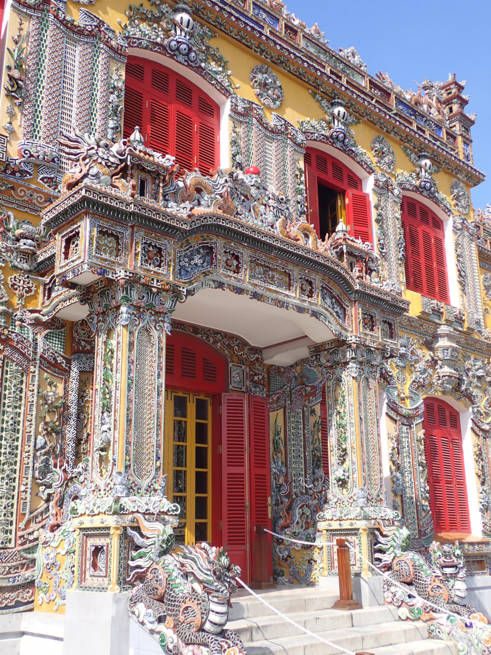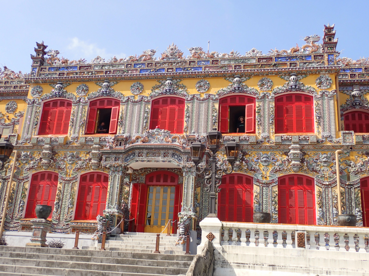 フランスの建築様式が融合されている建物は黄色地に赤い窓枠とサンシェード、美しい陶磁器で彩られています。