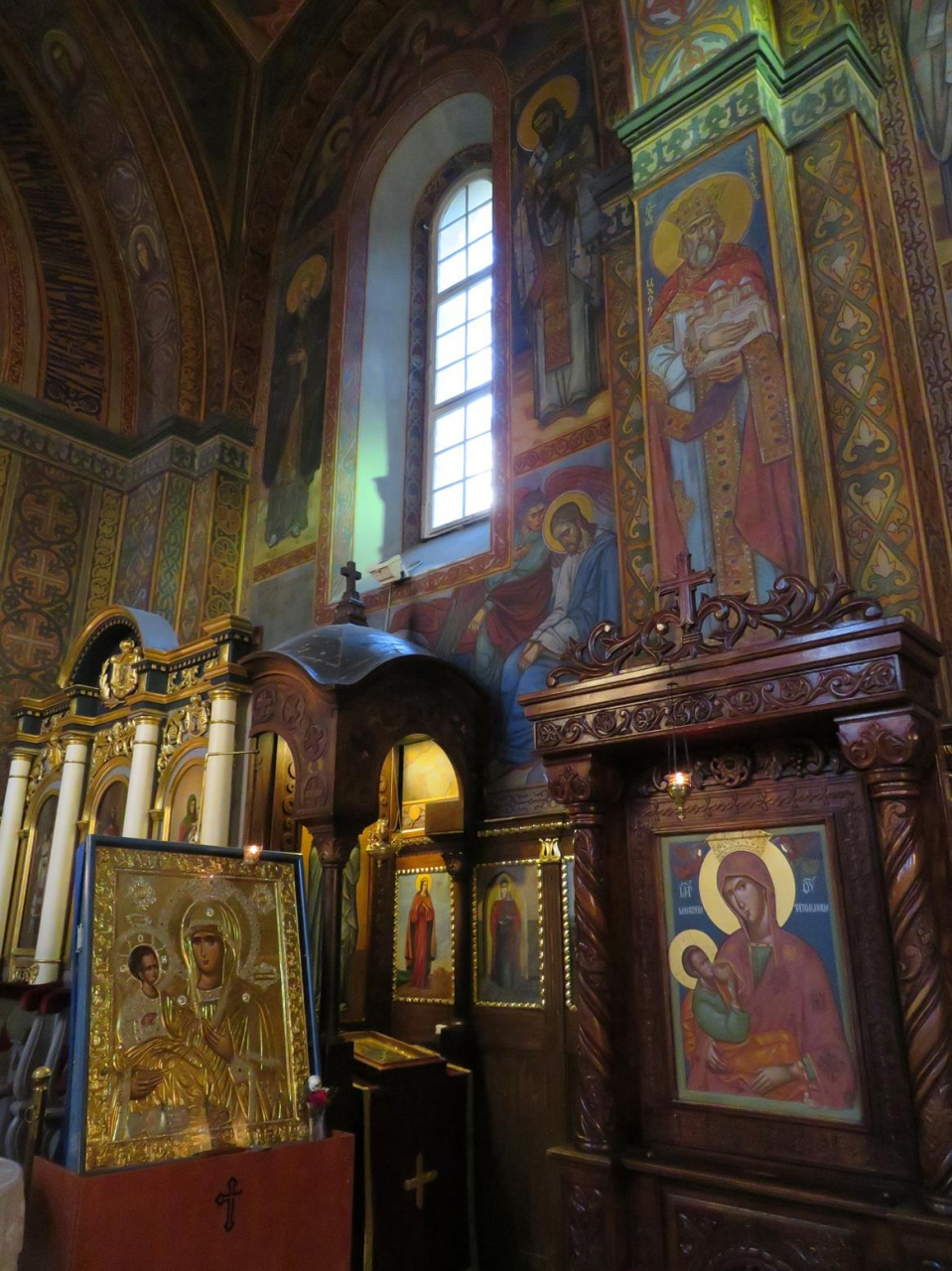 現在の可愛らしい外観とは裏腹に、内部の薄闇に浮かび上がる壁画や天井画、イコノスタシスなどの装飾は重々しく見ごたえあり。