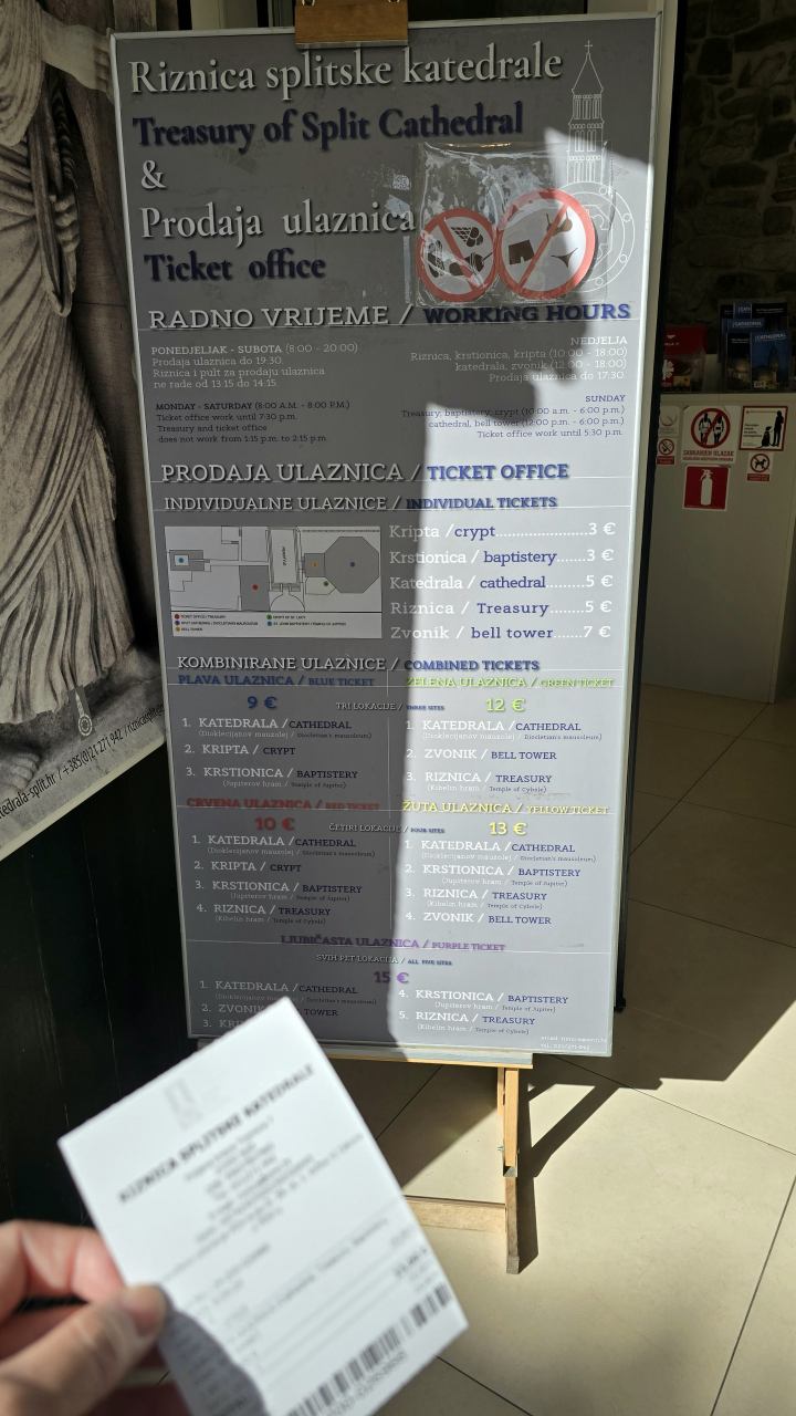 大聖堂・宝物殿・鐘楼・洗礼室・地下室とあり、私は全部乗せAll includeな紫色のチケットを購入しました。入口にわかりやすく表が掲示してあります。