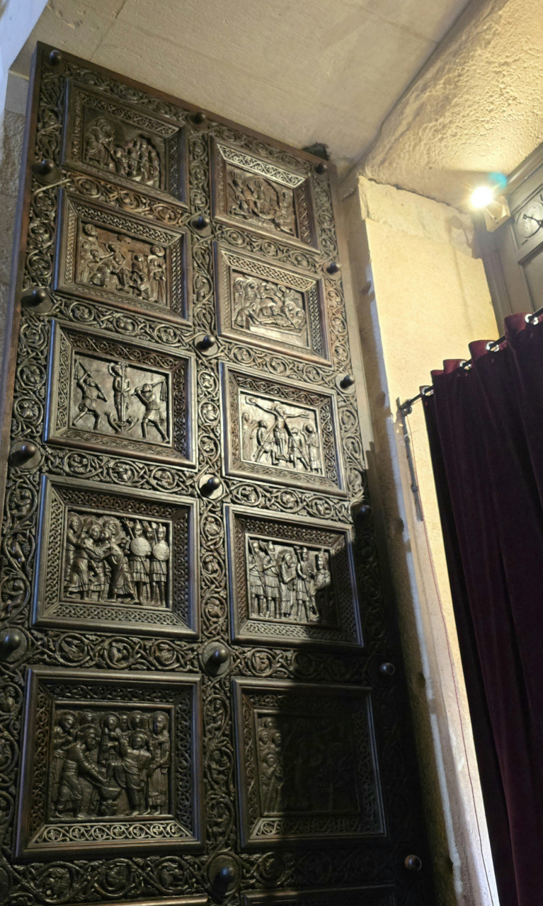 内部に目が行きがちですが、扉が素晴らしいです。クルミ材で出来ていて、新約聖書の28場面が彫られています。