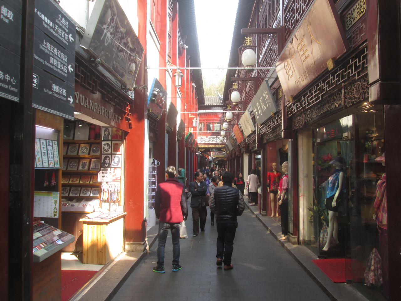 手芸市場の近くに豫園商城と言う清朝時代みたいなつくりのお土産屋さんエリアがあったので行ってみました。内部はこんな感じになっていて、ぎっしりとお土産屋さんやおやつ屋さんなどが並んでいました。中国の国内旅行の人や欧米などからの海外旅行者を見かけました。