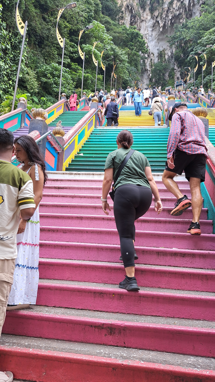 正面には、金色の巨大なスカンダ神と、272段のカラフルな大階段が見えます。入場料金は無料です。