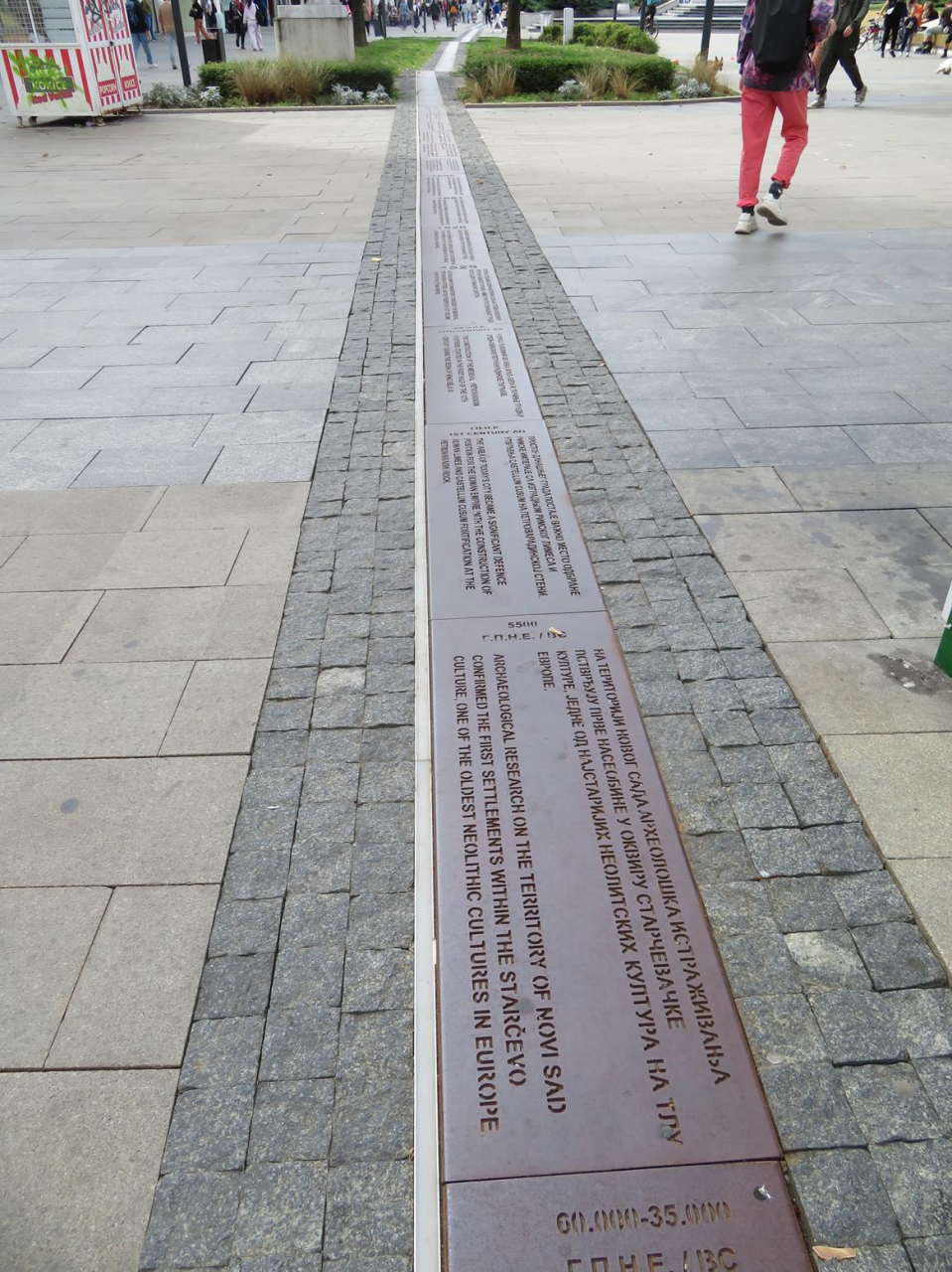 私たちは外観見学だけになったんですが、劇場前の通路に沿って石器時代から2022年までのセルビアの出来事が刻まれたプレートが長々と敷かれていたのに興味を引かれました。