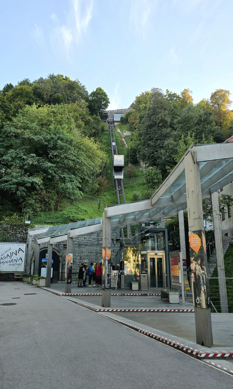 リュブリャナ城へは徒歩ルートがありますが、体力温存と時間節約でケーブルカーを利用しました。