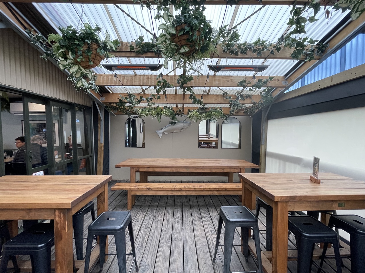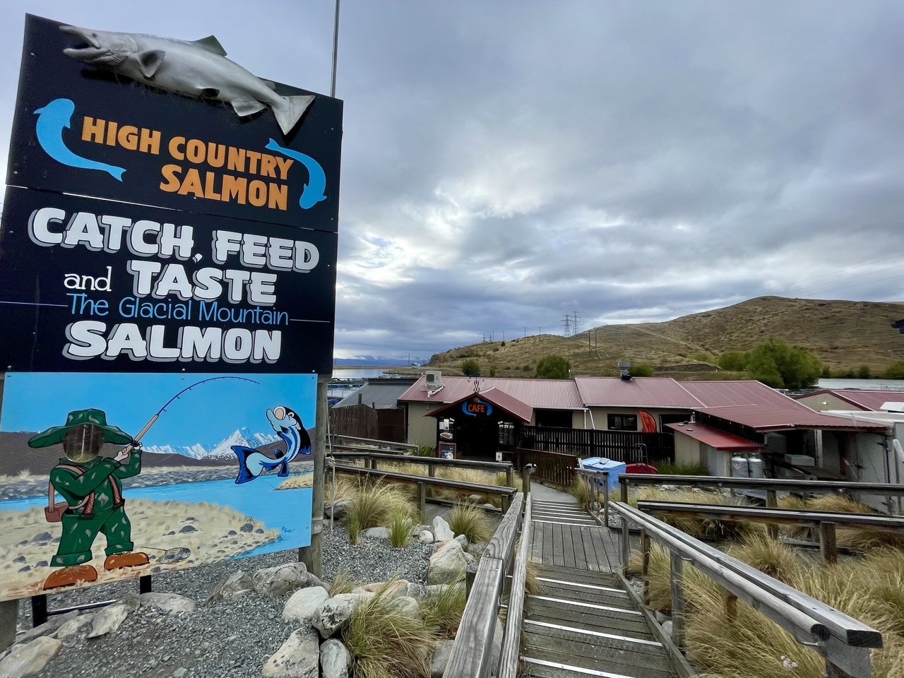 時間帯によっては、キングサーモンへの餌あげ(無料)や希望すれば、生けすでのキングサーモン釣りが可能です。レストラン以外には、サーモンのブロックなど持ち帰り品などもそろっています。