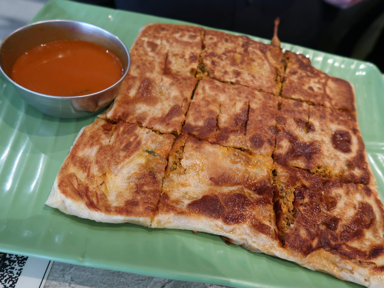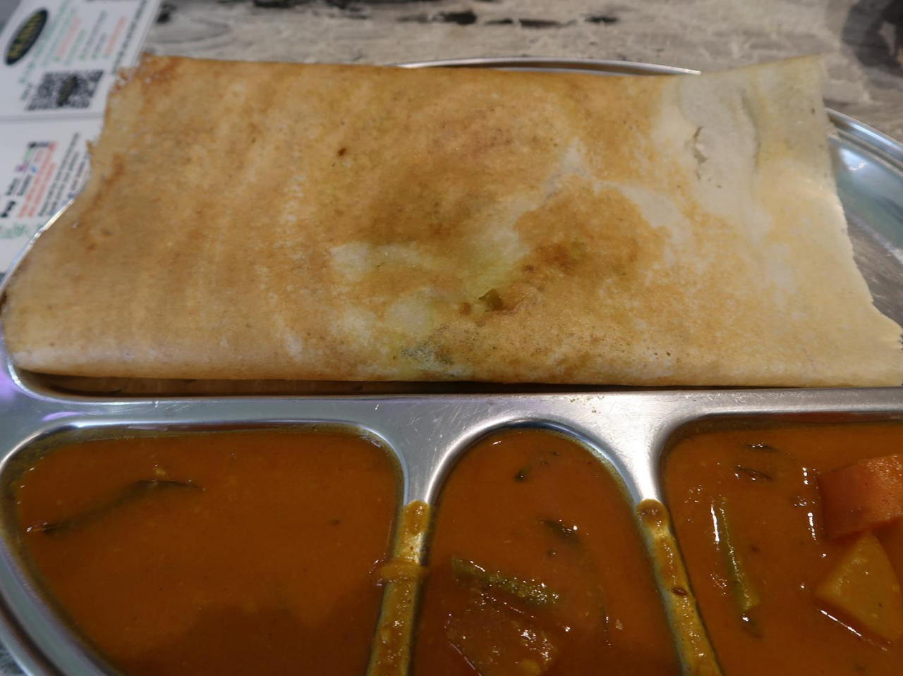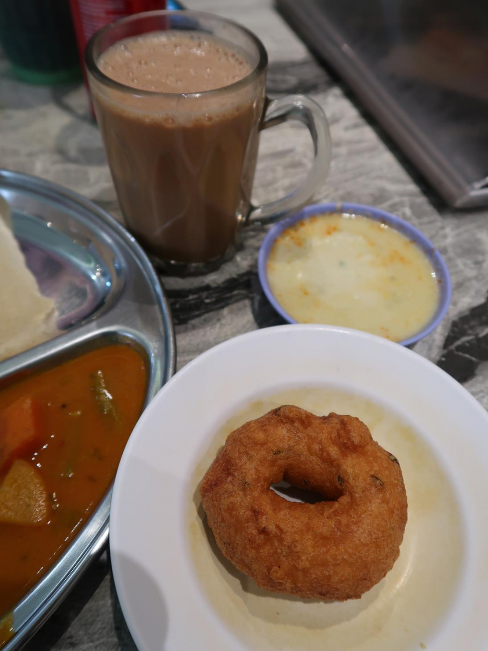 私たちはまずはお試しでマサラ・ドーサ(薄~く焼き上げたクレープ風の生地にジャガイモカレーを包んだもの)+ワダ(甘くないドーナツ)+テー・タレック(濃いミルクティー)のセットと、マトンのムルタバ(お好み焼き風に具と共に焼き上げた料理)を注文。
