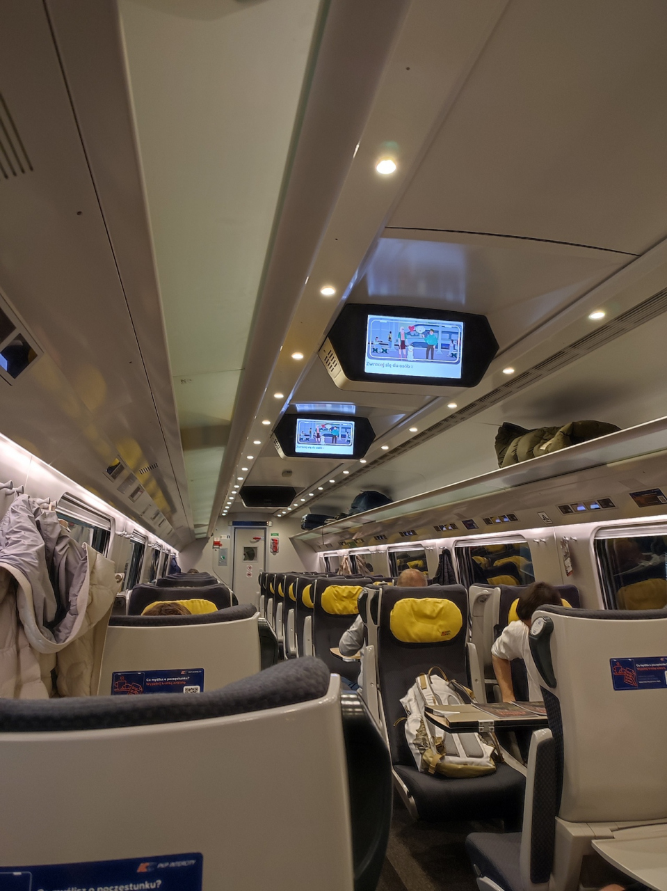 ワルシャワからクラクフまでの移動で利用。ホームページからの予約で早割があり、45%オフで購入できたのでせっかくなので一等を利用しました。一等は一人席があります。乗車後しばらくしたら軽食を選ぶメニューを持ってきてくれます。車内は新幹線などに比べるとカーブでの揺れは大きめでドリンクをこぼしているお客さんもいましたが、総じて快適で良かったです。