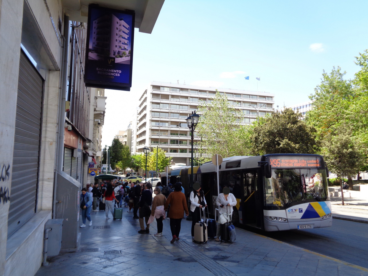 シンタグマ駅から出ているX95番に乗車しました。常時数台のバスが停車していて、時刻表通りに先頭から発車しているようです。チケットは乗り場のブースで購入できます。5.5ユーロ、カード支払い可。