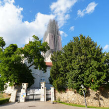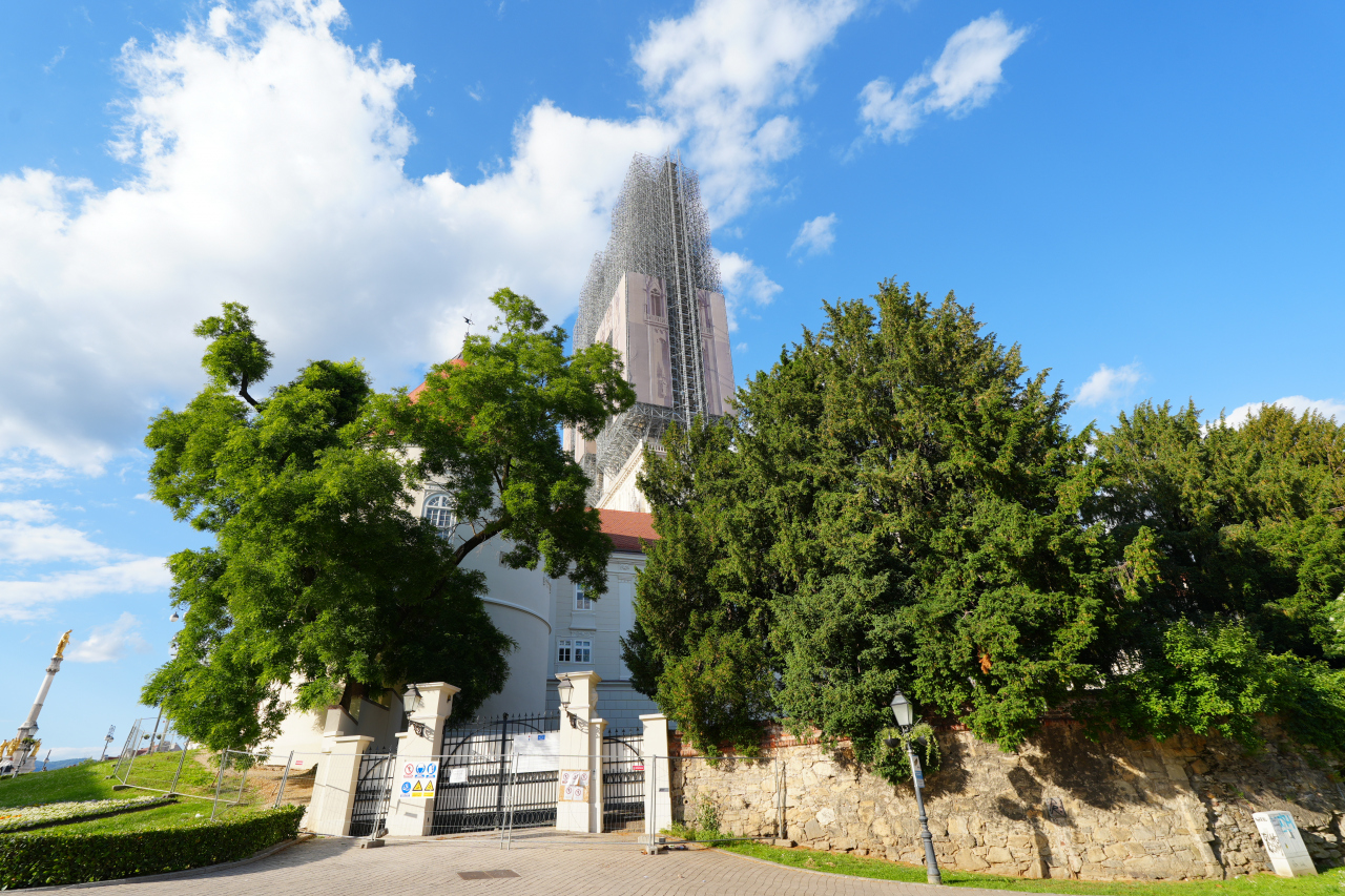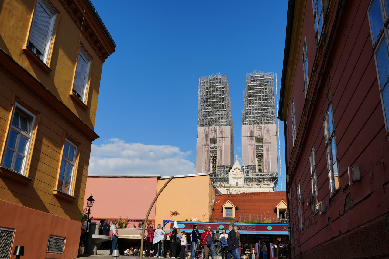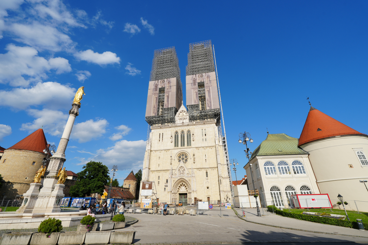 5月の後半にザグレブへ観光に訪れましたが、市内の主な観光施設はの南といってよいほど休業-改修中でした。ザグレブのもう一つの象徴、聖マルコ教会も改修中で、付近は立入禁止ではありましたが、外観は見ることができました。一方、もう一つの象徴ともいえるこの聖母被昇天大聖堂は、象徴的な二本の塔も改修中で、全面が工事用のファサードで覆われて代わりに塔の絵が描かれていました。