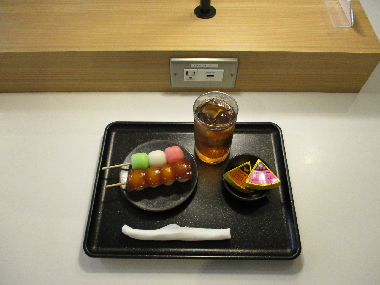JALサクララウンジのデザートとして、チーズセットがあります。6月に利用したときは、団子がメニューに加わっていました。甘めのカラフルな色の団子にみたらし味の2種類でした。旅行前、炭水化物を控えていましたが、折角の機会なので、気にせず2本注文しました。