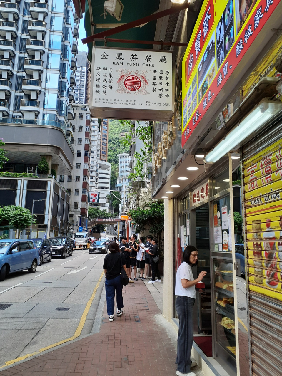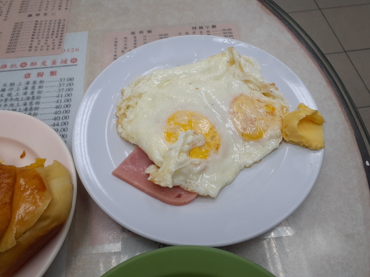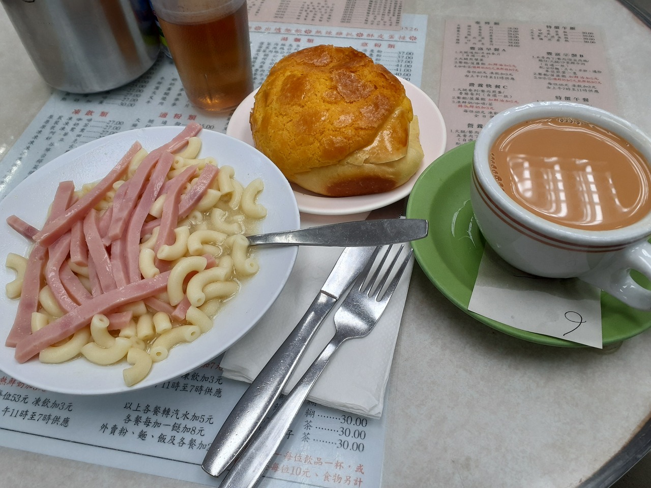 香港のど定番の朝食をいただこうと訪問させていただきました。注文したのは、Aセット。マカロニのスープ、パイナップルパン、目玉焼きにミルクティー。