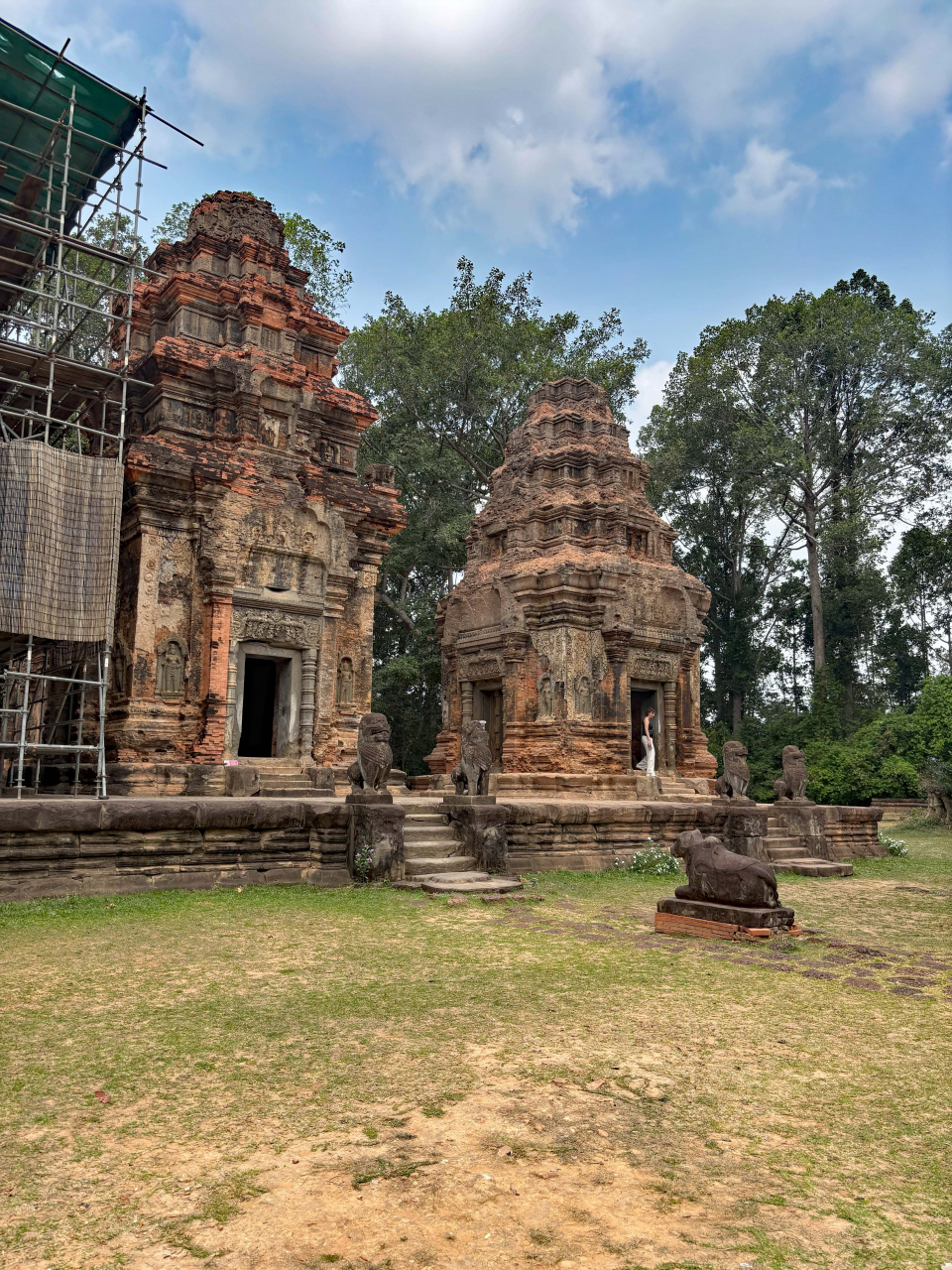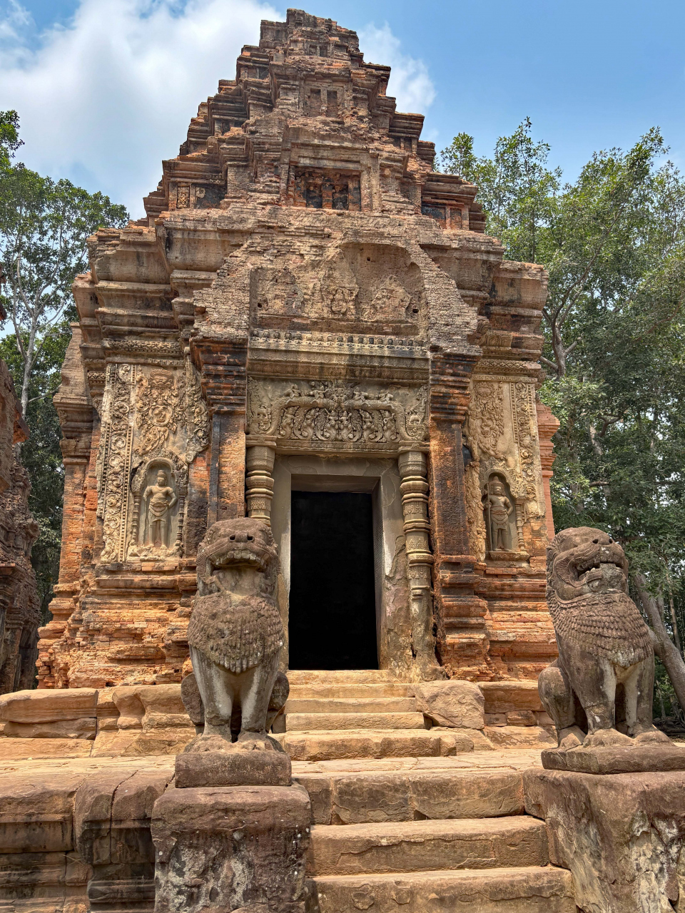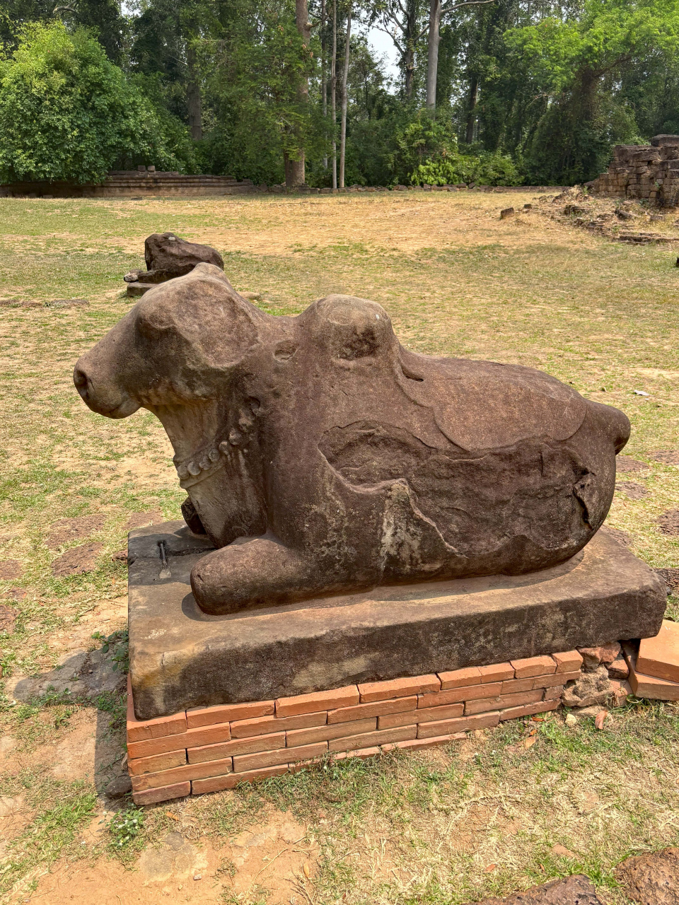 プリア コーはシェムリアップの東方数kmにあるロリュオス遺跡群の一つで、アンコール王朝のインドラヴァルマン1世(治世:877-889)が879年に建造したシヴァ神を祀ったヒンドゥー教の寺院です。「プリア・コー」とは「聖なる牛」の意味で、寺院内に聖牛(ナンティン)が配置されていました。