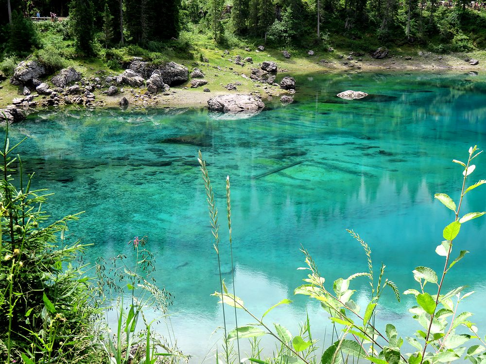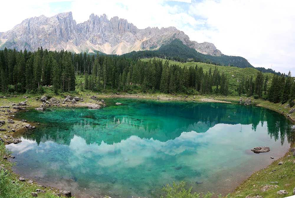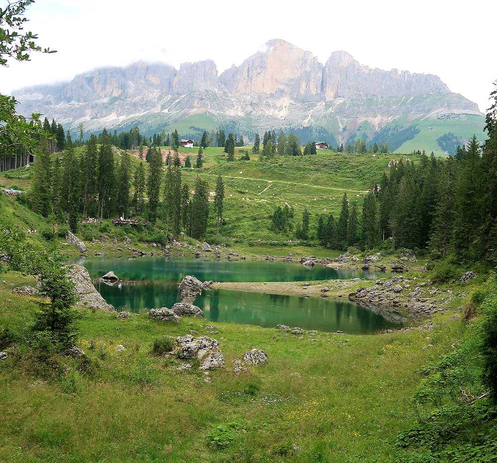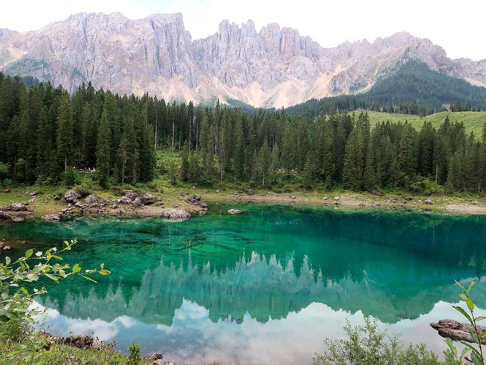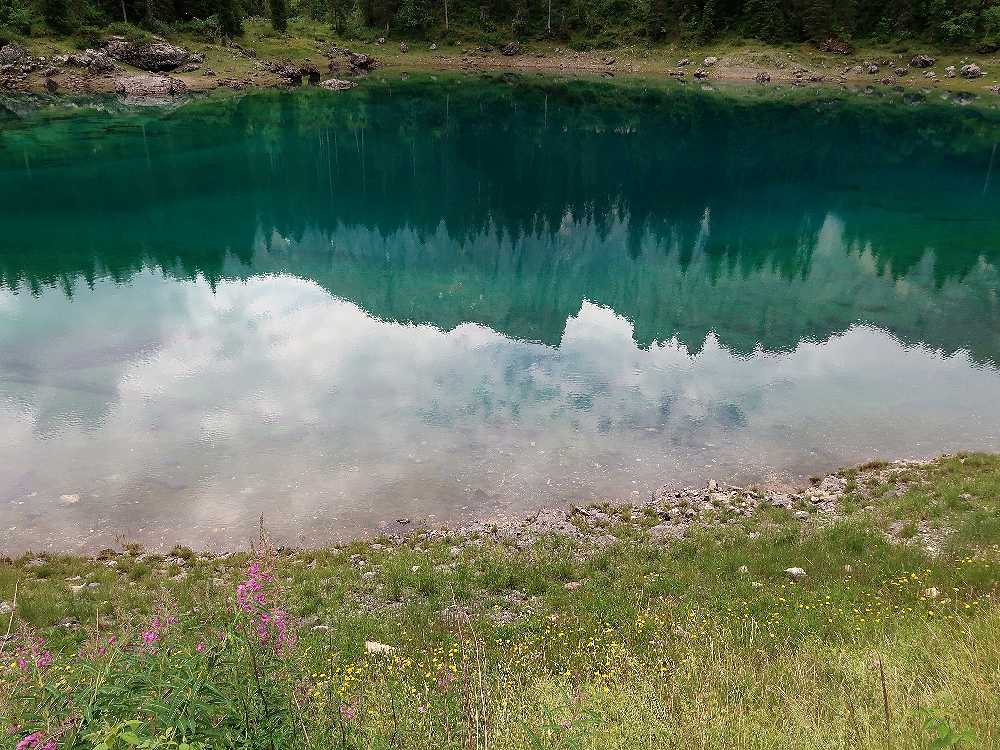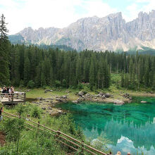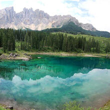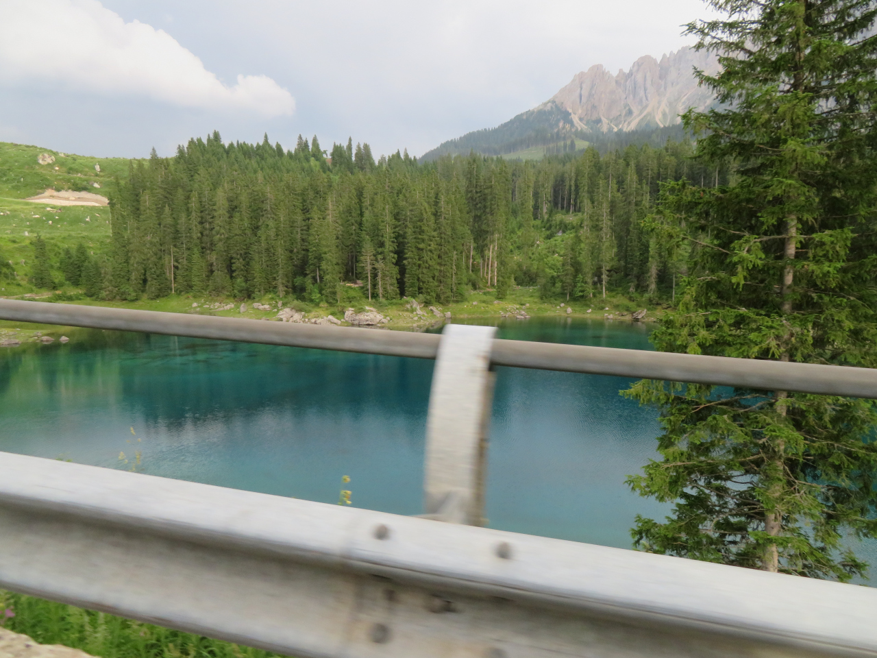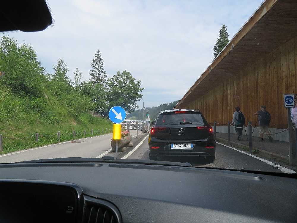 カレッツア湖は、2009年に駐車場に入って見学したことはあったのですが、残念ながらラテマールの頂上付近に雲がかかり、きれいな写真は撮れませんでした。二度目は、今年(2025年)の7月4日、ファッサ谷方面からボルツァーノに戻るときに立ち寄ることが出来ました。この時は、入口のゲート前に何台か待機車両があったのですが、ゲートへの入口が右側にあったため、辛うじて後続車両の邪魔にならないように並ぶことができたおかげで、無事駐車場に入ることができました。反対にボルツァーノ方面からくる車は、左折してからゲートに入る必要があり、対向車線が混んでいたため、ゲートに入ることは難しそうでした。湖の入口前の道路は片側一車線のため、通過する車をやり過ごすスペースがなく、道路に待機すると通過するだけの車の迷惑になるからです。できれば朝早くか夕方遅くに訪れることをおすすめします(湖の一番きれいに見える時間帯ではありませんが)。