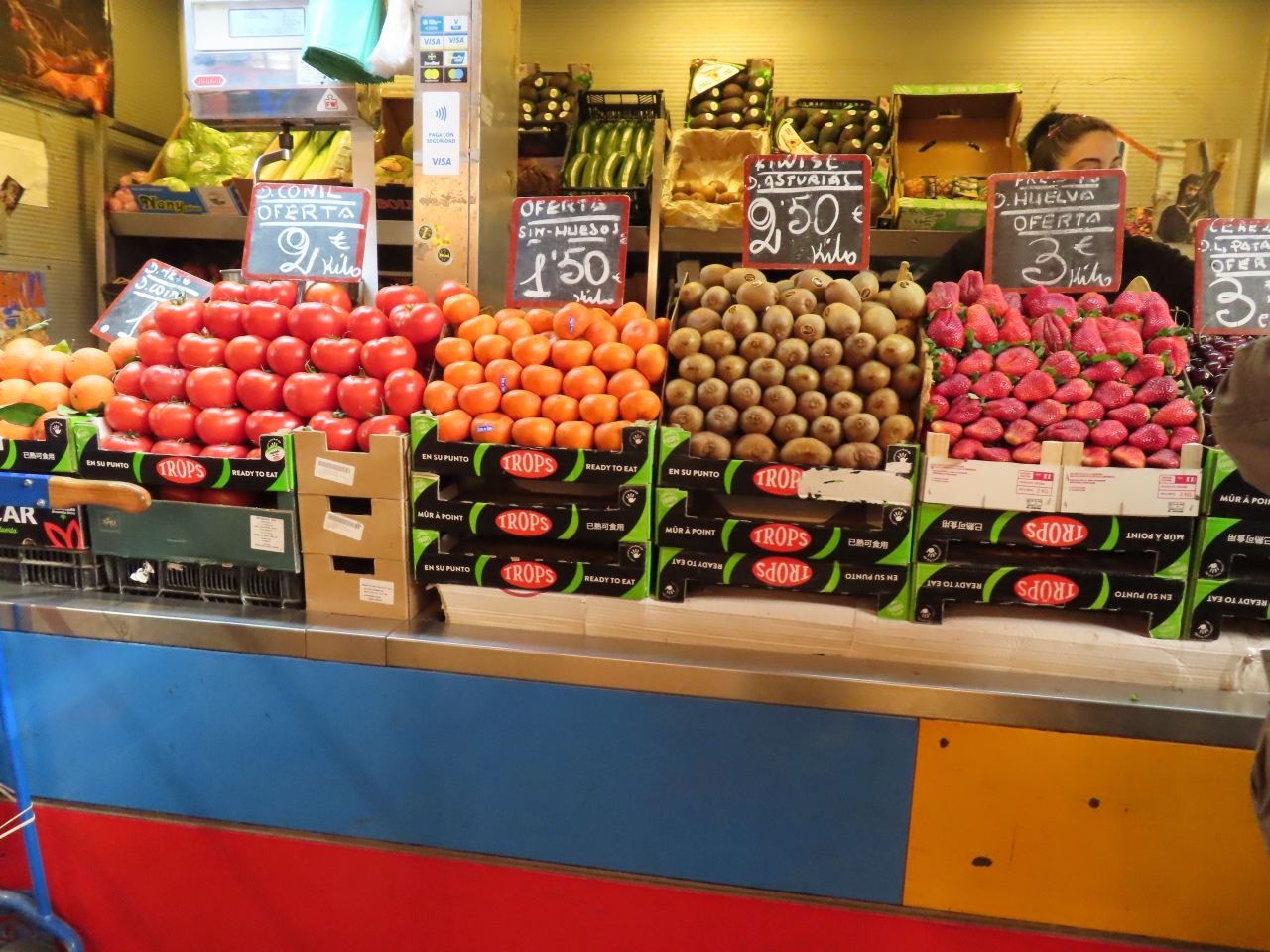 スペイン旅行中、各都市の市場にいきましたが、マラガのこのアタラサナス中央市場 が一番楽しかったです。 色とりどりの食材であふれ地元の人も観光客もどちらも楽しめる場所でした。 アパートを借りている場合などはこちらで購入されるといいと思いました。 アーモンドやドライフルーツも多く売っていますのでお土産を探すのにもいいと思います。