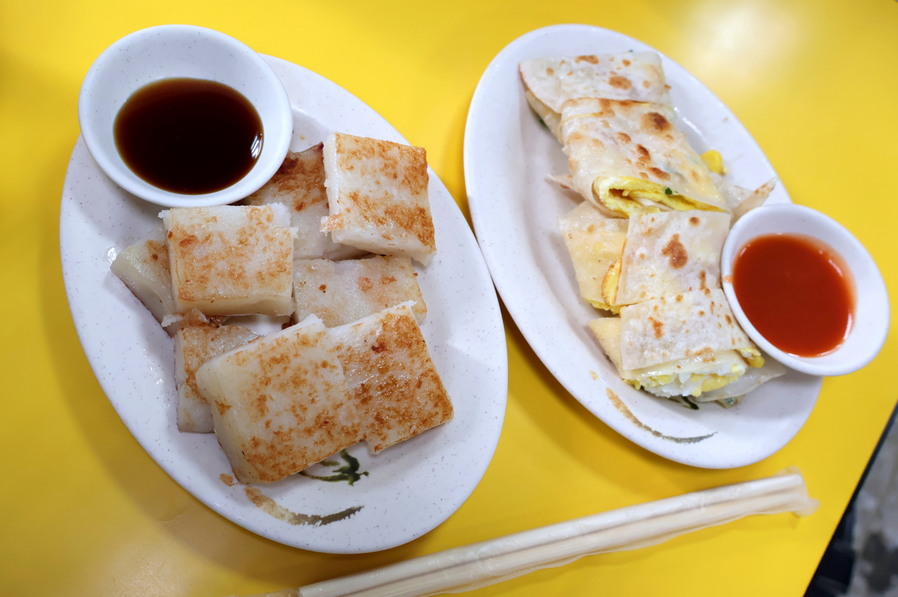 台湾の朝ごはん定番メニュー、スープの中におぼろ豆腐が浮かぶ「シェントウジャン」の店、目玉焼きをくるんだクレープのような「蛋餅」、大根餅もおいしい