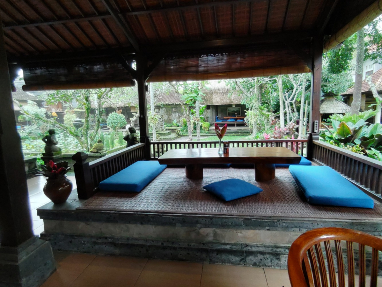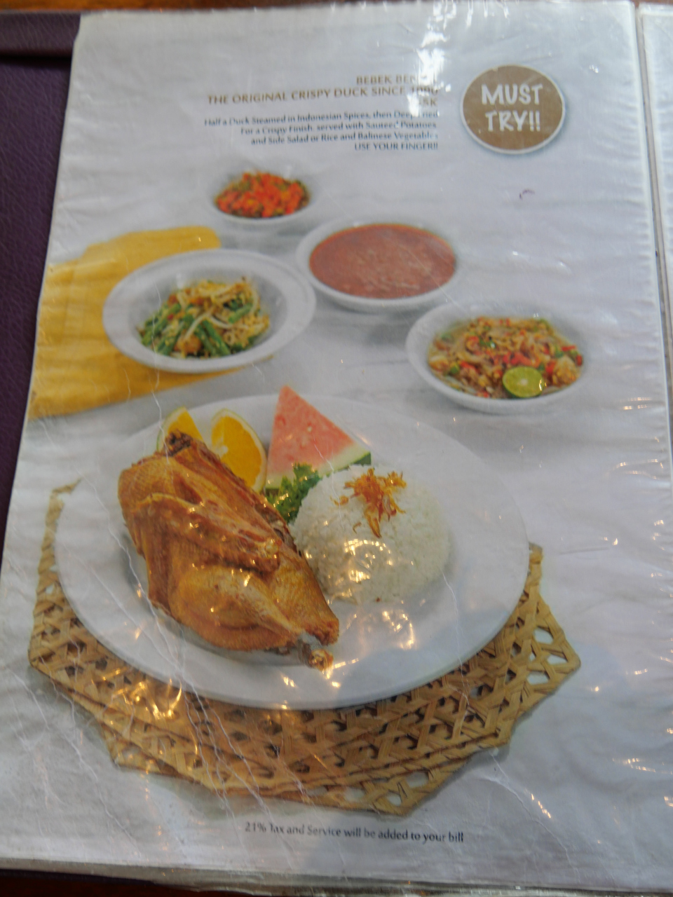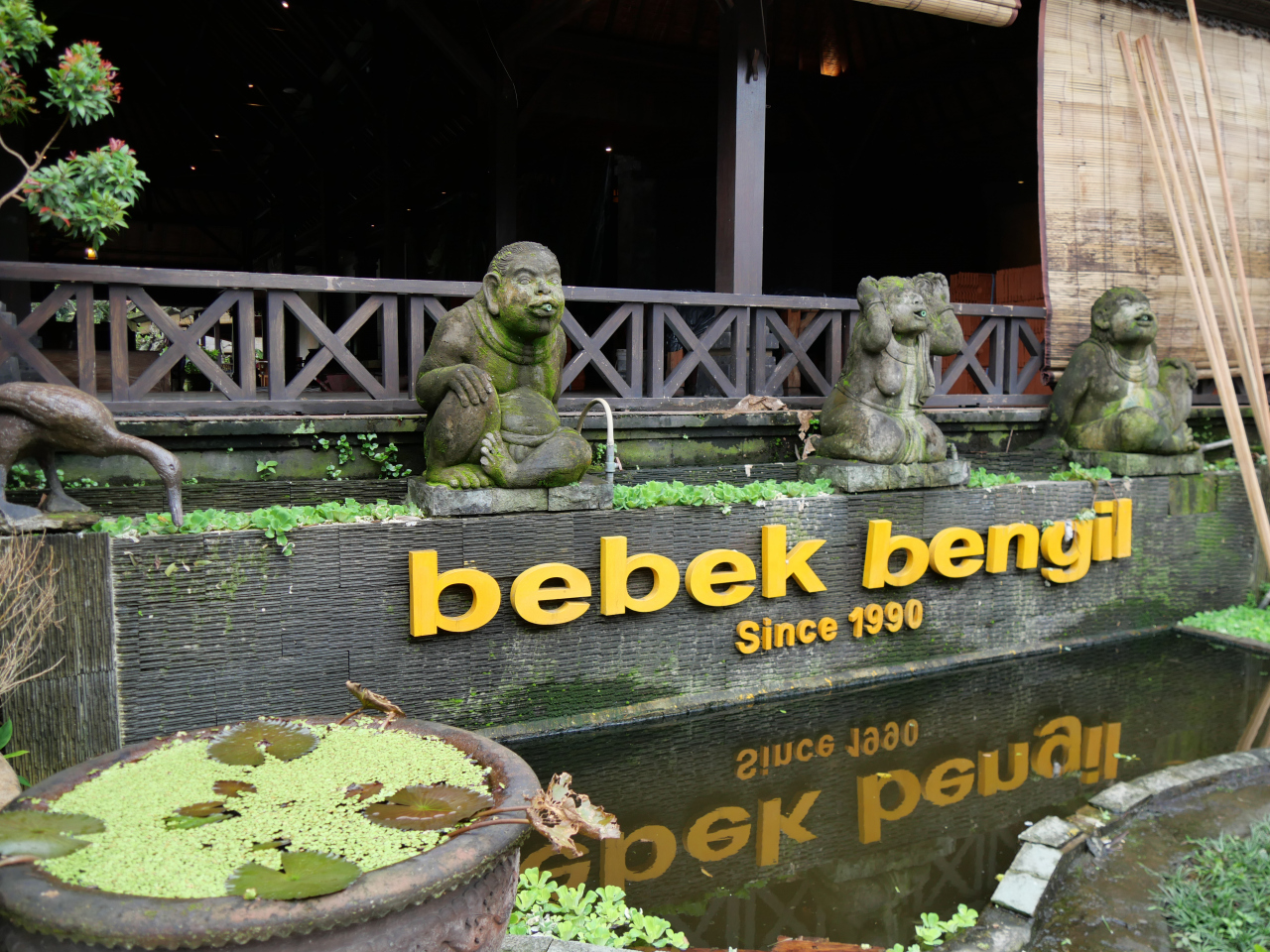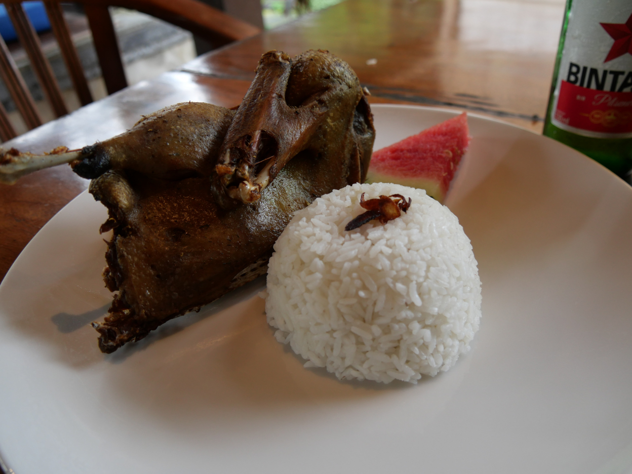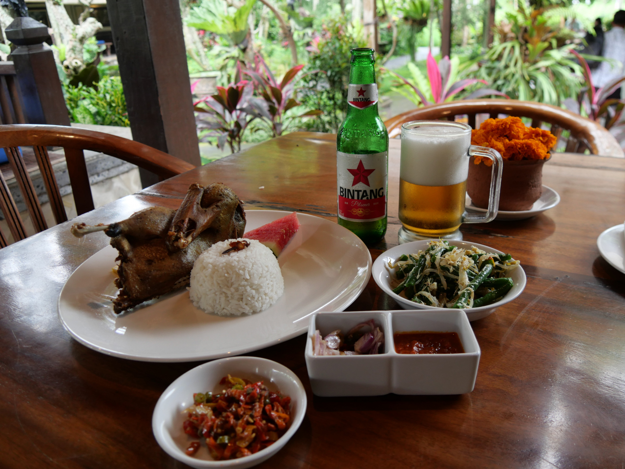 旅行ガイドブックを見て、ランチで訪れたました。この店の名物だというクリスピーダックは、スパイスに漬け込んだアヒルの半身肉を煮てから更にオイルで揚げてあり、皮はパリパリで身はジューシーでとても美味しいです。店舗も緑に覆われた中庭とバリらしい雰囲気の客席があってゆっくり食事が楽しめます。