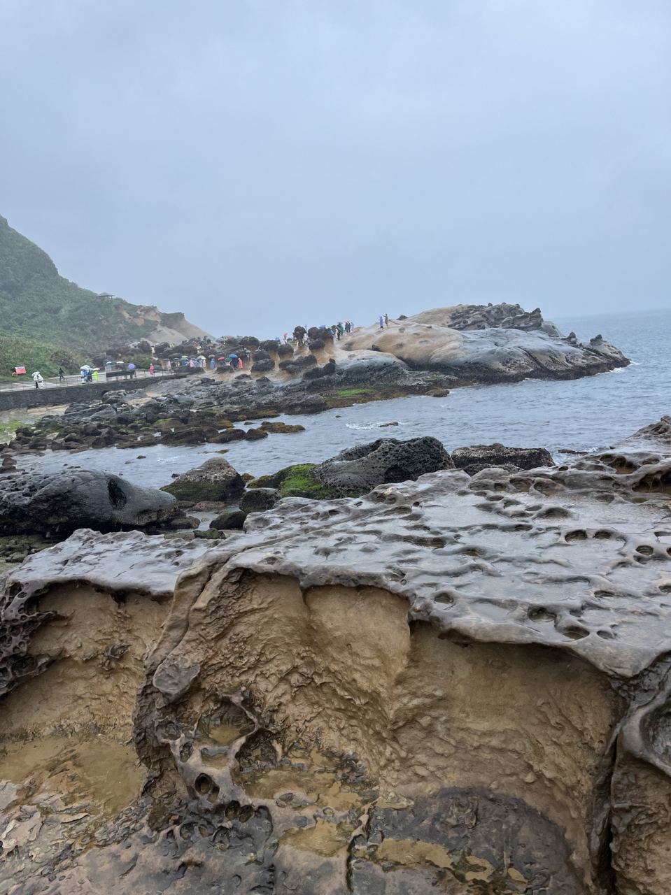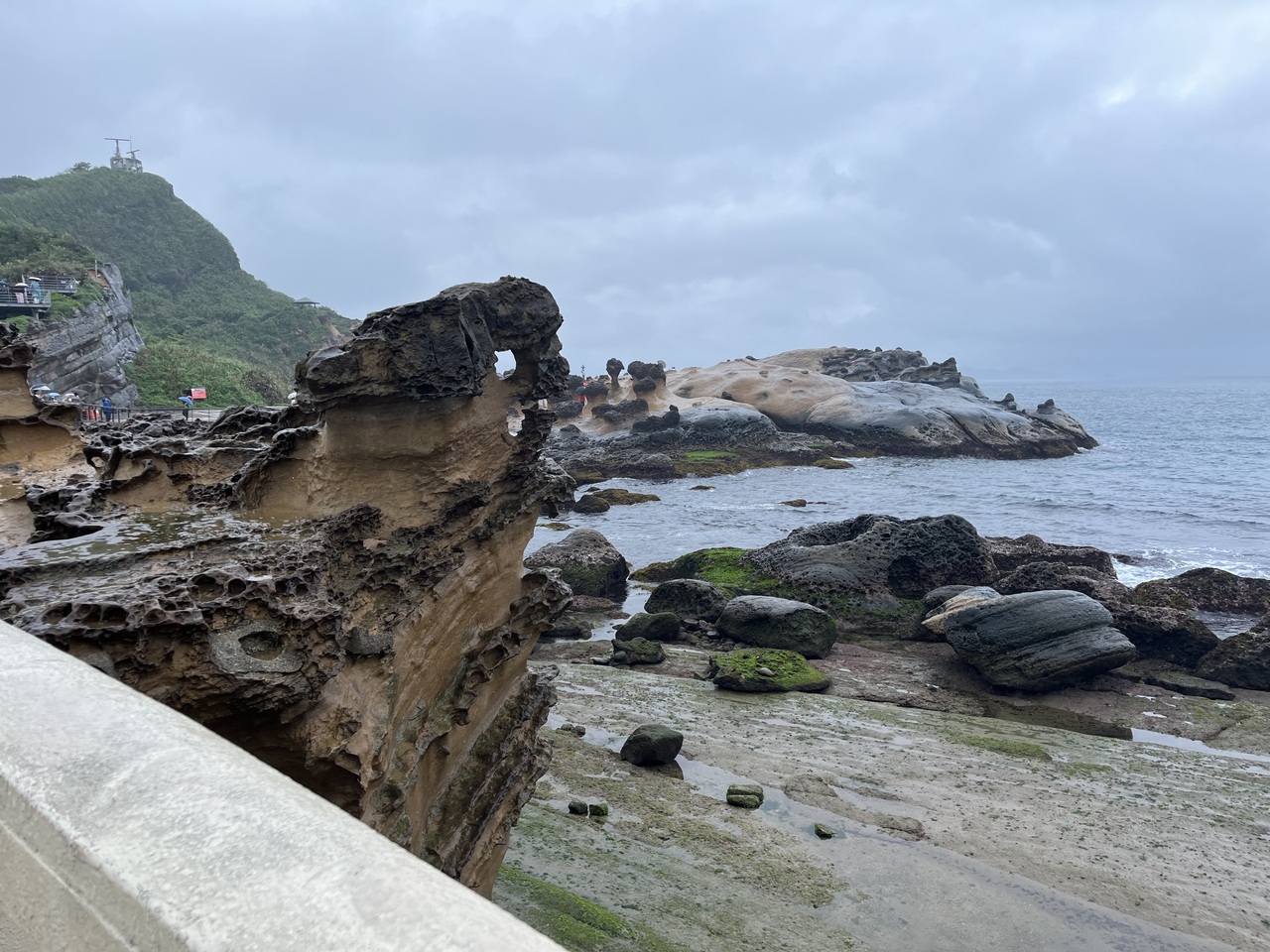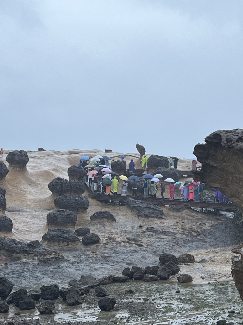 ツアーの最初が野柳地質公園、大雨の中カッパを着て参戦します。波の侵食で不思議な形の岩が誕生するのですが、1番有名なクイーンズヘッド、首の部分がものすごく細くなっており、あと数年で頭部分が落ちるのでは?と言われてます。