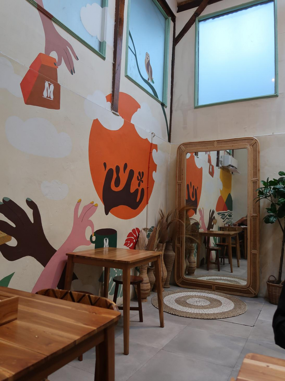 - 一階のほか地下階にも席があります。ちょっと狭いですがポップな壁の絵で明るい雰囲気。