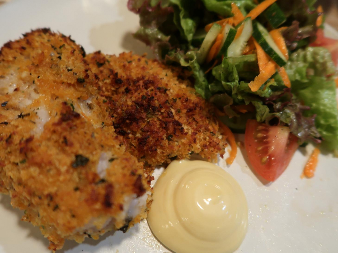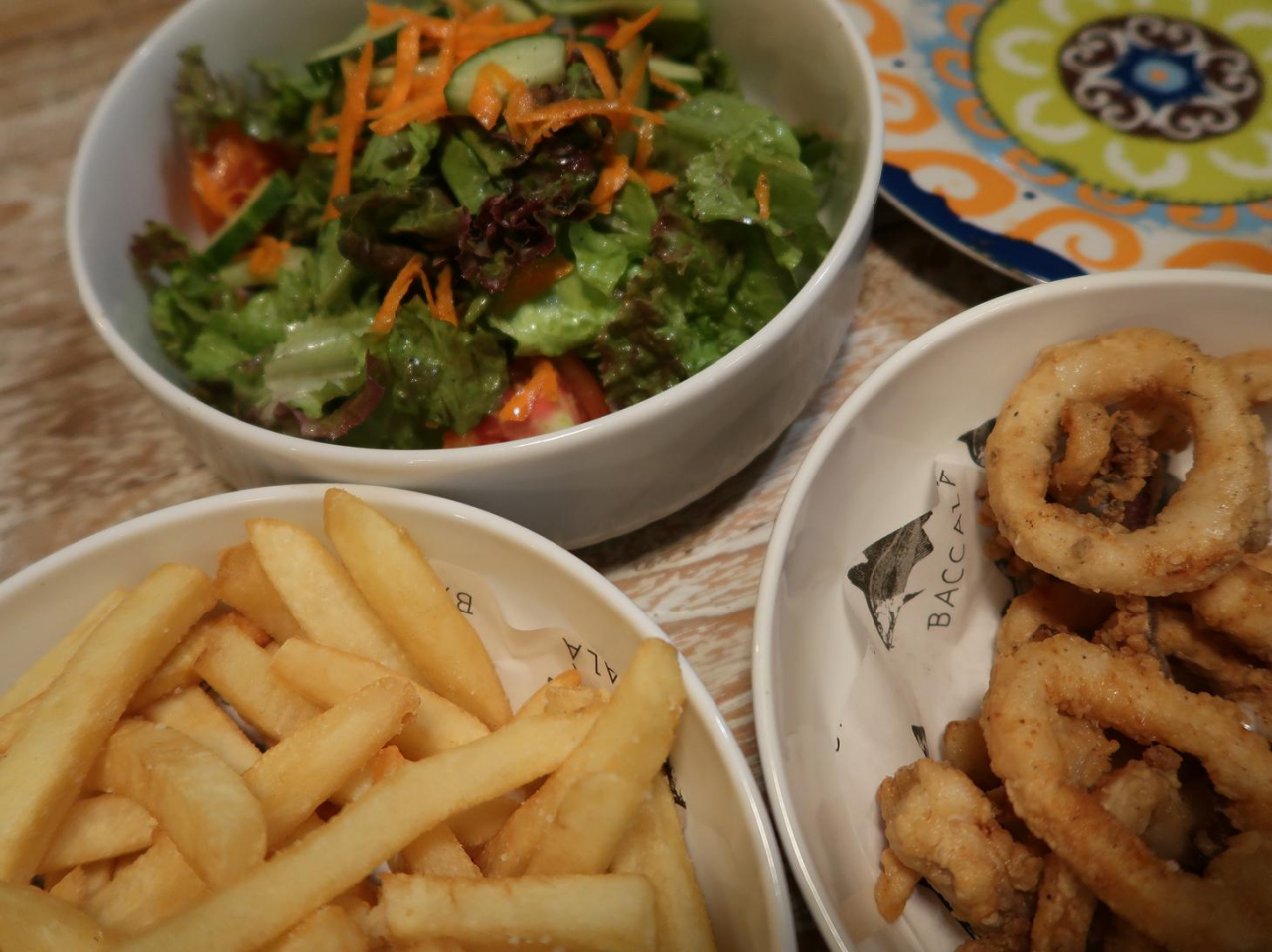 私たちは、その日のお勧めのカラマリのほか、タラのパン粉焼き、サラダとフレンチフライを取ってみたところ、多からず少なからずのちょうどいい量。