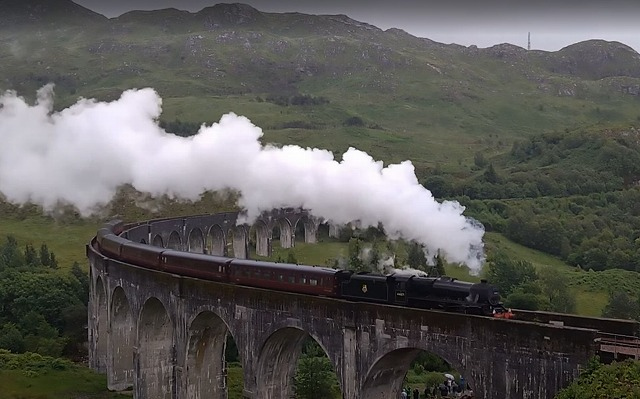 夏の間はフォートウィリアムーマレイグ間に蒸気機関車けん引のJACOBITE号が2往復運転されています。大型の蒸気機関車が古い客車を引いて走る姿が見られます。