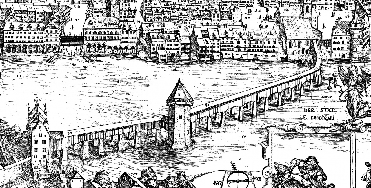 屋根付きの木橋・カペル橋(1333年)と17世紀という110枚の歴史画、旧市街に残る見事な「フレスコ画」・壁画の建物、