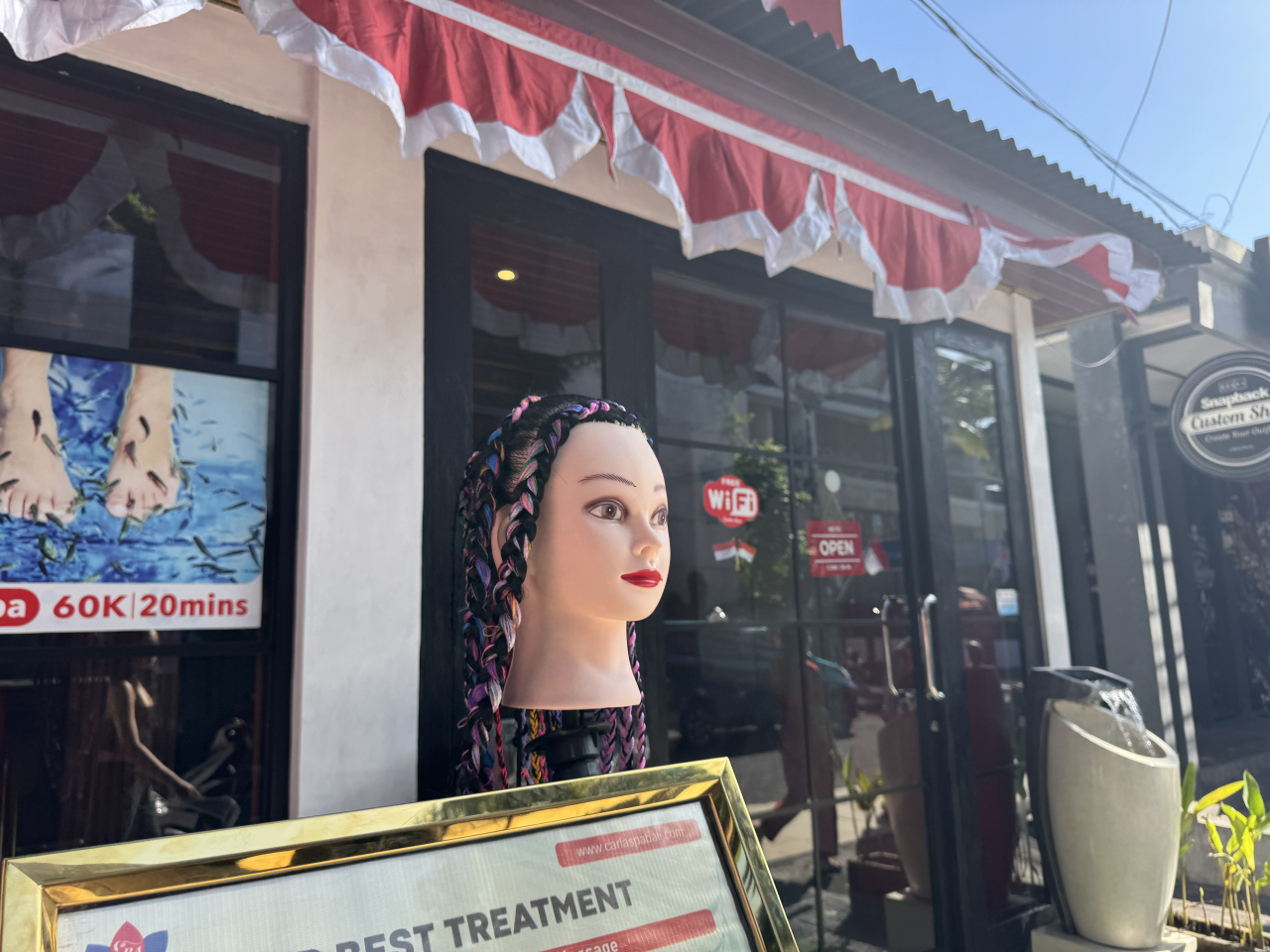 クタの中心部にある人気のマッサージ店です。編み込みなどもお手軽価格でお勧め。
