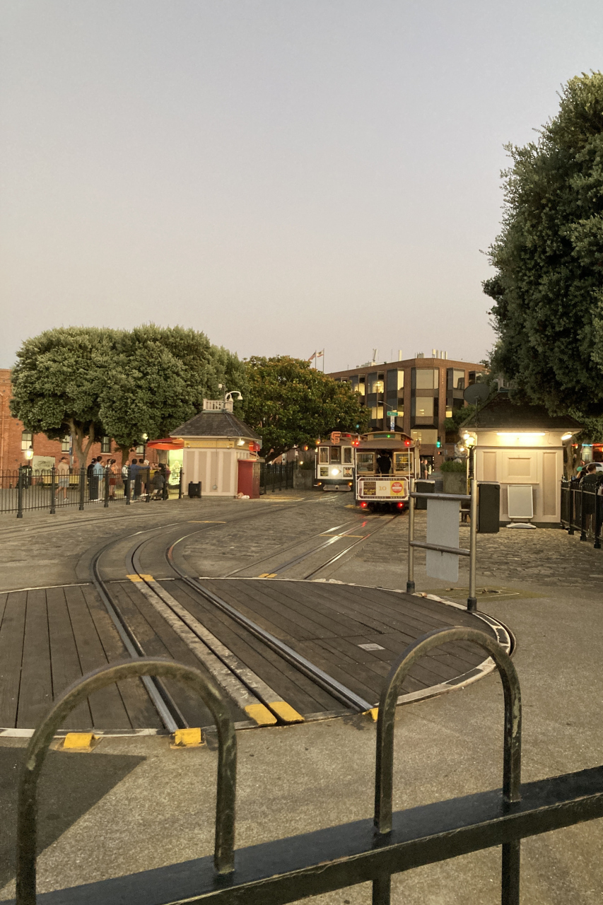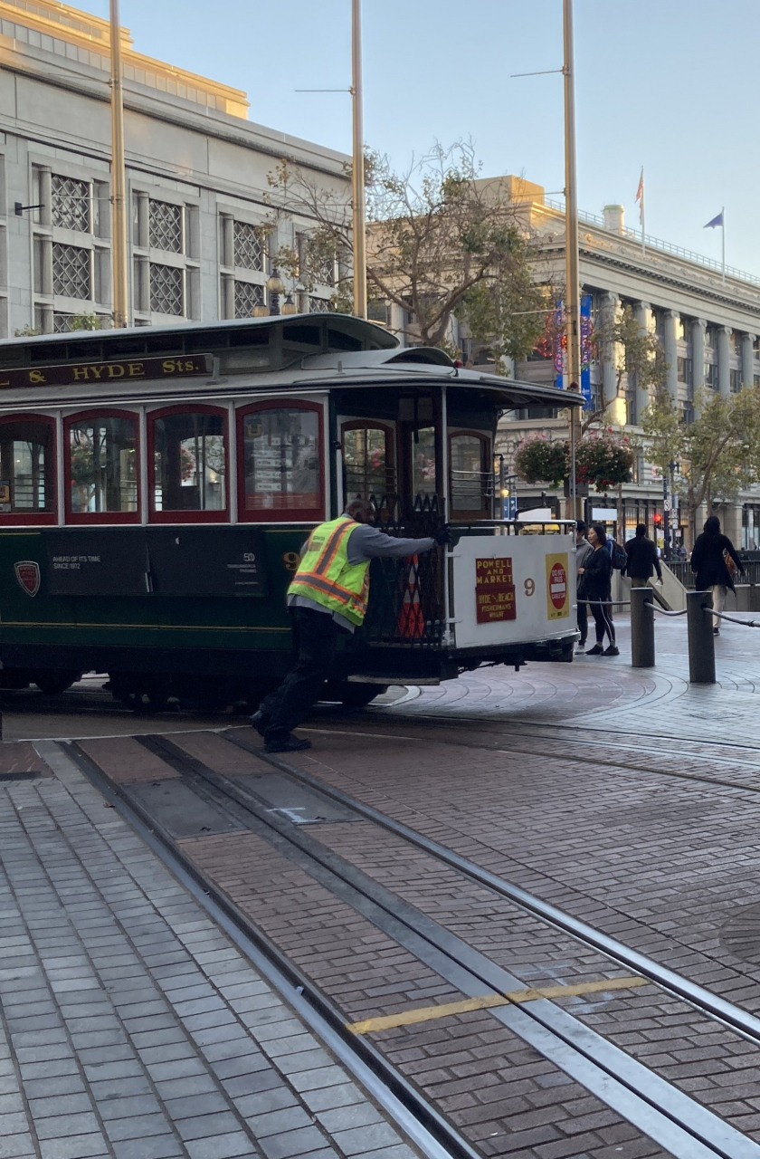 ホテル近くのパウエルストリートが始発であったのと、ここでは、人力回転(運転席が片方にしかないため、人力で転車台を回転し、ケーブルカーの先頭車両の方向を逆にする)を観ることができるので、ここからスタート。