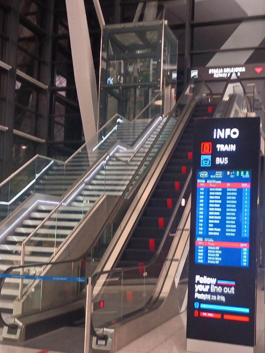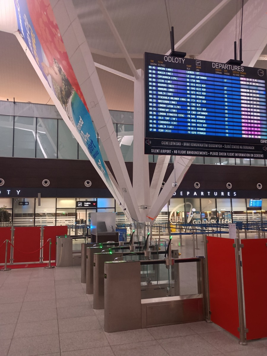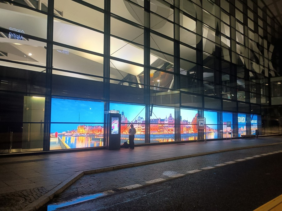 空港建物外の壁にグダニスクの運河の大きな写真画があり目を引きました。近代的で綺麗な空港です。