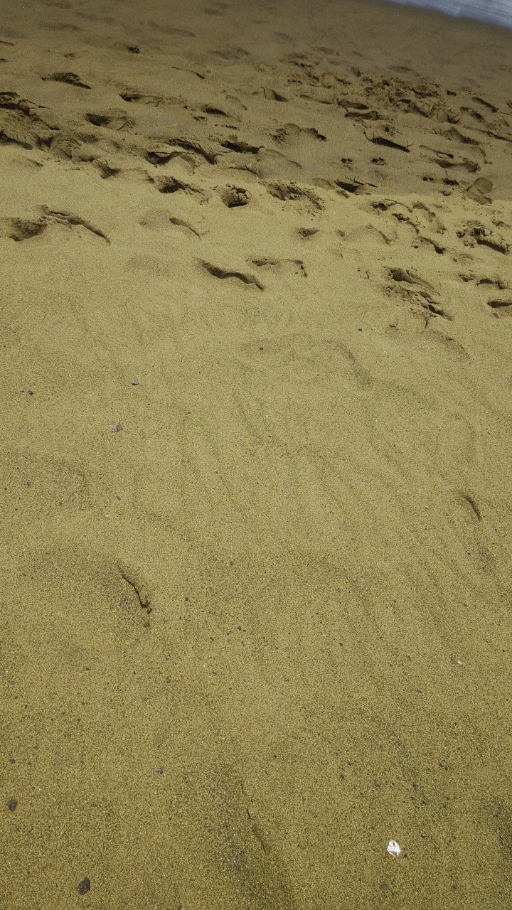 急こう配を一列で降りていくと、そこは本当に緑色に輝く砂浜だと分かります。