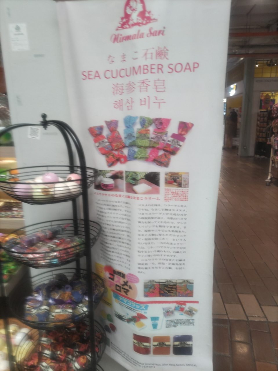 SEA CUCUMBERのエッセンシャルオイルソープ100グラムと書いてありました。無料の箱を1個に1つ入れてもらえました。有料の巾着などもあったようです。ハイビスカス、レモングラス、ローズなど購入。10個にするとRM160に割引してくれます。