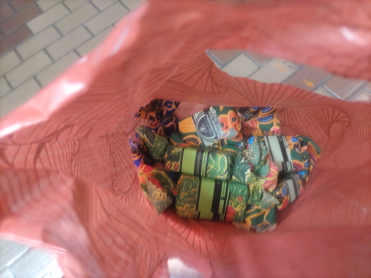 Nirmala Sariのかなり小さな石鹸は、可愛い布で包まれていて、10個で買うとRM60でした。2回で20個買いました。ハイビスカスの香りの人気らしいです。私は、ハイビスカス、ココナッツ、ローズ、レモンなどにしました。結構香りが強いので、ジップロック二重にしてスーツケースに入れました。