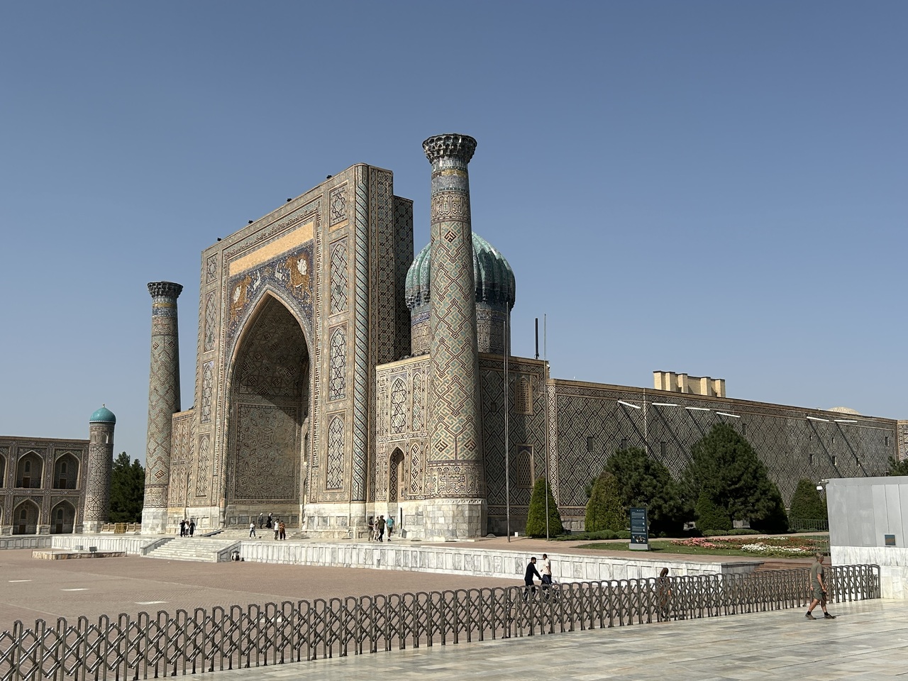 このメドレセの全体像は中庭を含めて、レギスタン広場の他の2つに比べて落ち着いた印象があります。入口の上部に描かれたライオンと人の顔は、結構楽しい感じです。