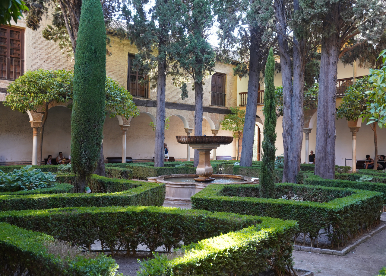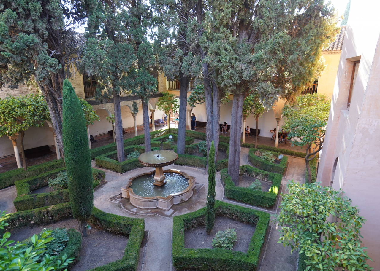 アルハンブラ宮殿の「リンダラハの中庭」は二姉妹の間とカルロス5世の部屋に面しています。二姉妹の間にはバルコニーがあり、そこからの眺めがとても良いのです。回廊からはアルバイシン地区の全体を見渡すことができます。