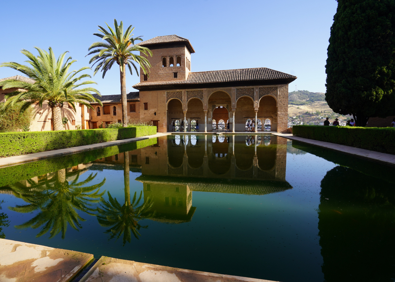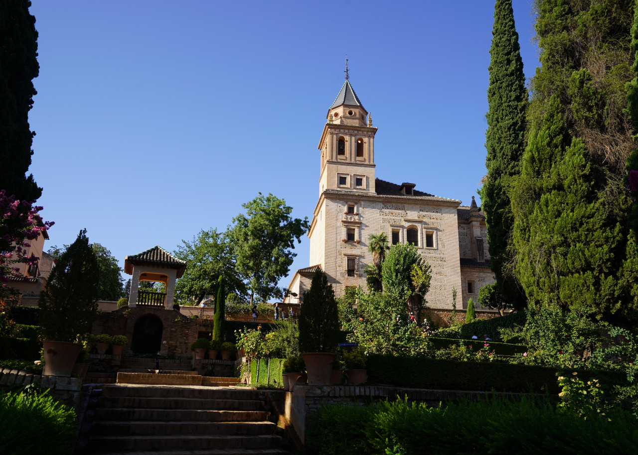 アルハンブラ宮殿内には大きく4つの宮殿があり、最も栄えていたとされるナスル朝宮殿を過ぎると、パルタル庭園がありますが、「婦人の塔」はその中にあります。時代によって持ち主も変わり、「婦人の塔」の名前は18世紀頃についたようです。ちなみに、5つのアーチを描く柱廊があることから、柱廊という意味の「パルタル」と当初は呼ばれていたそうです。パルタルは出産という意味もあり、女性のために造られた庭園でもあるようです。「婦人の塔」に当時暮らしていたのは大貴族たちで、パルタル庭園の中でも重要な建物でした。その名前からもわかるように、ハーレムだったという話もあります。宮殿内で古い装飾が施されていることでも知られています。美しい庭です。