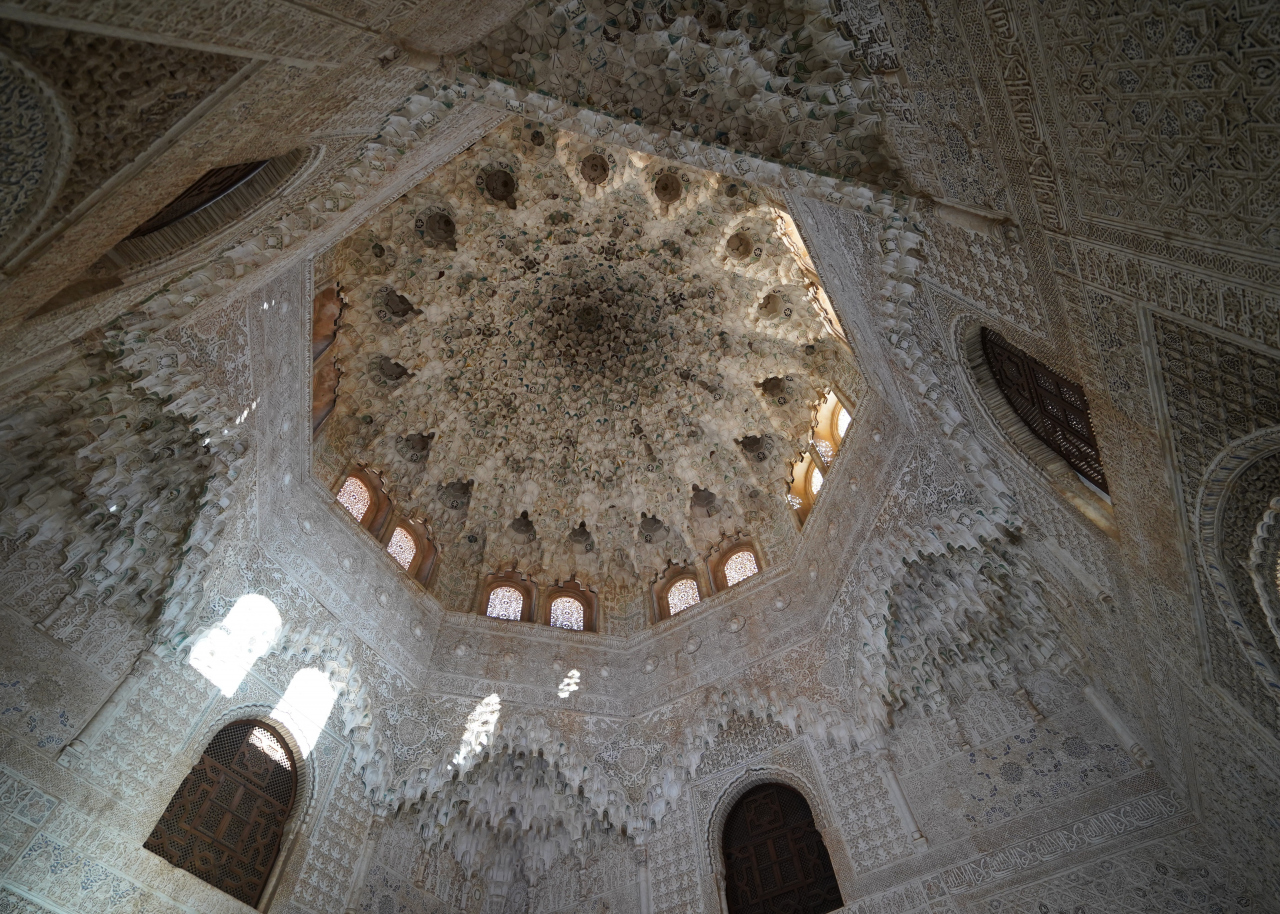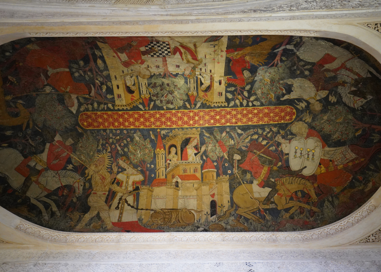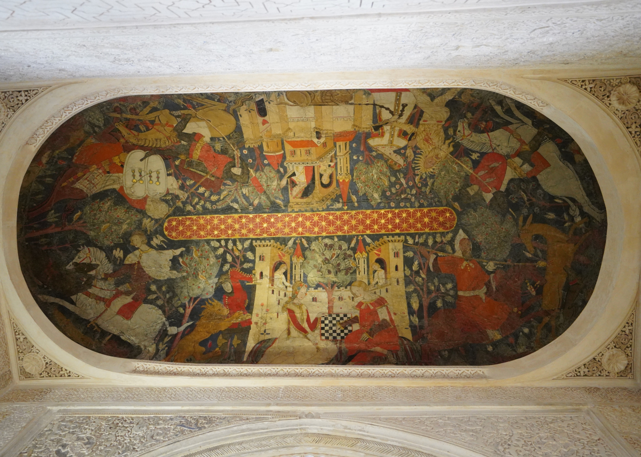 アルハンブラ宮殿の諸王の間には、美しい鍾乳石飾りの付いた三連アーチの柱廊を通ってライオンの中庭から入ることができます。天井を見上げると細かな彫刻に囲まれて、ナスル朝の10人の王様の肖像画が描かれていました。みんな、手には長い剣を持っています。白い壁に黄金の背景や朱色の衣服が鮮やかで、とても美しい絵でした。